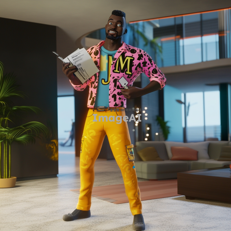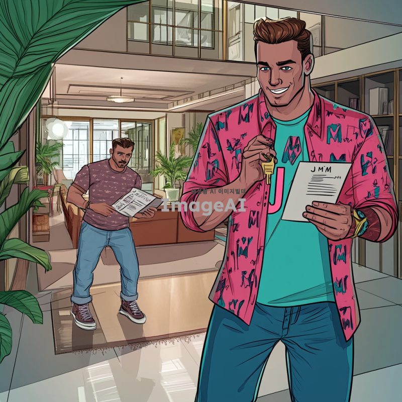 임대인 "J"는 졸라맨 스타일의 캐릭터로, 밝은 색상의 셔츠와 바지를 입고 있으며, 한 손에는 열쇠를 들고 있습니다. 얼굴에는 "J"라는 글자가 크게 적혀 있습니다. 배경은 현대적인 아파트 단지로, 깔끔하고 밝은 분위기를 연출합니다.