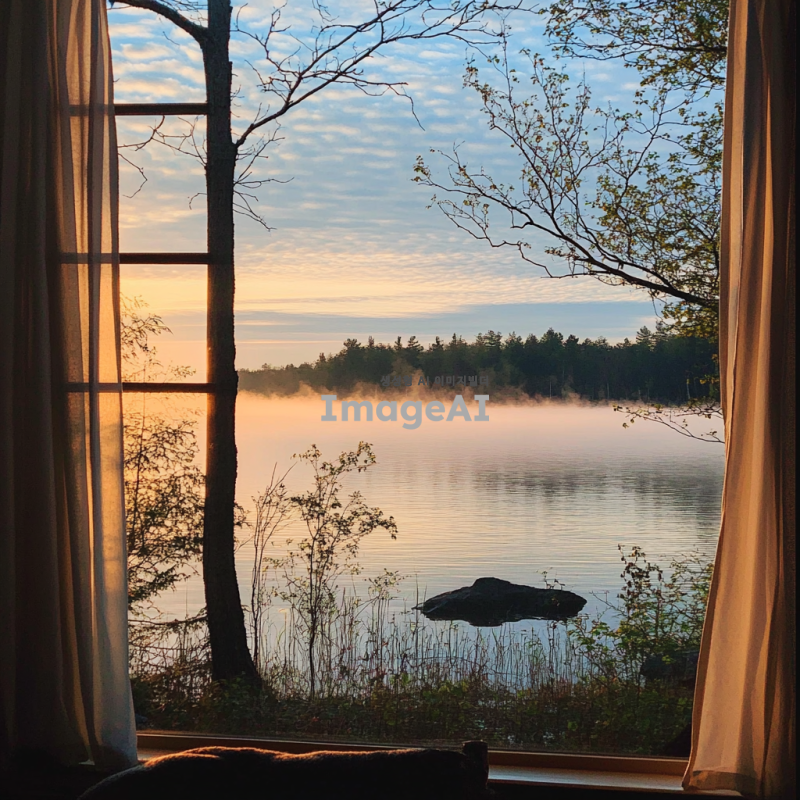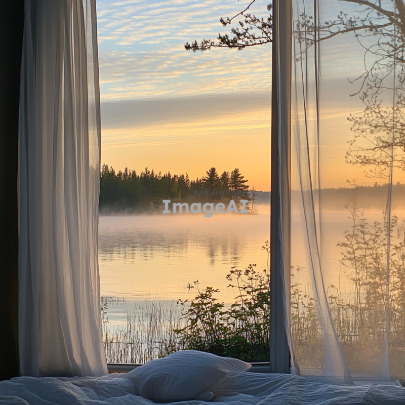 창문에 있는 커튼 너머로 호숫가가 보이고, 호숫가의 물이 아름답게 방안으로 흘러들어오는 모습을 지켜보고 있는 나의 모습. 방 안은 아늑하고 따뜻한 느낌을 주며, 자연의 아름다움과 평화롭고 몽환적인 분위기가 느껴지도록 해주세요.