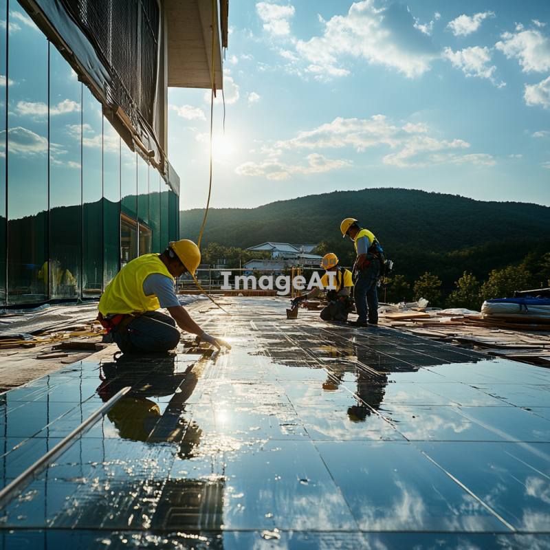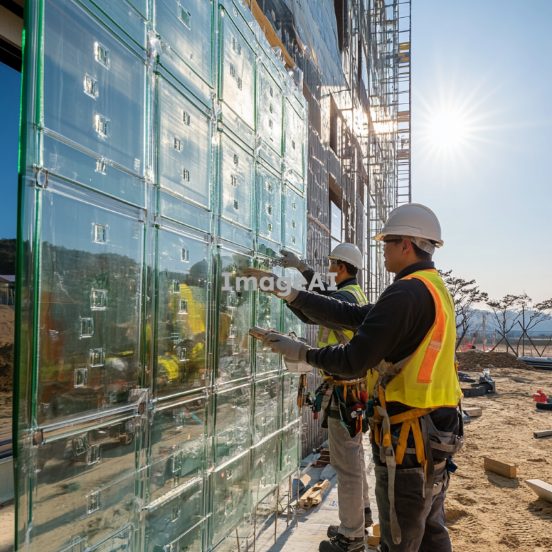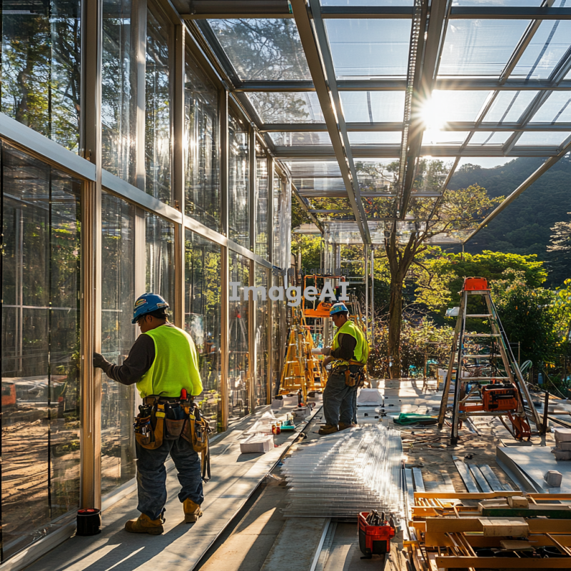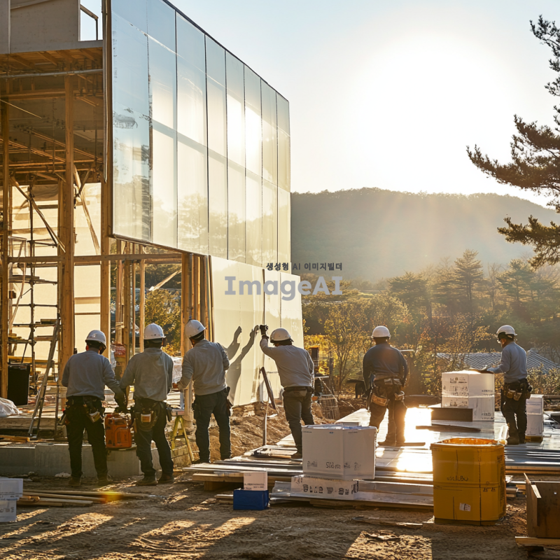 렉산 패널을 설치하는 한국인 작업자들이 현장에서 협력하여 시공하는 모습, 햇빛이 비추는 야외 환경, 다양한 도구와 장비를 사용하여 신중하게 작업하는 모습, 주변에는 시공 중인 건물과 자연 경관이 어우러진 장면.