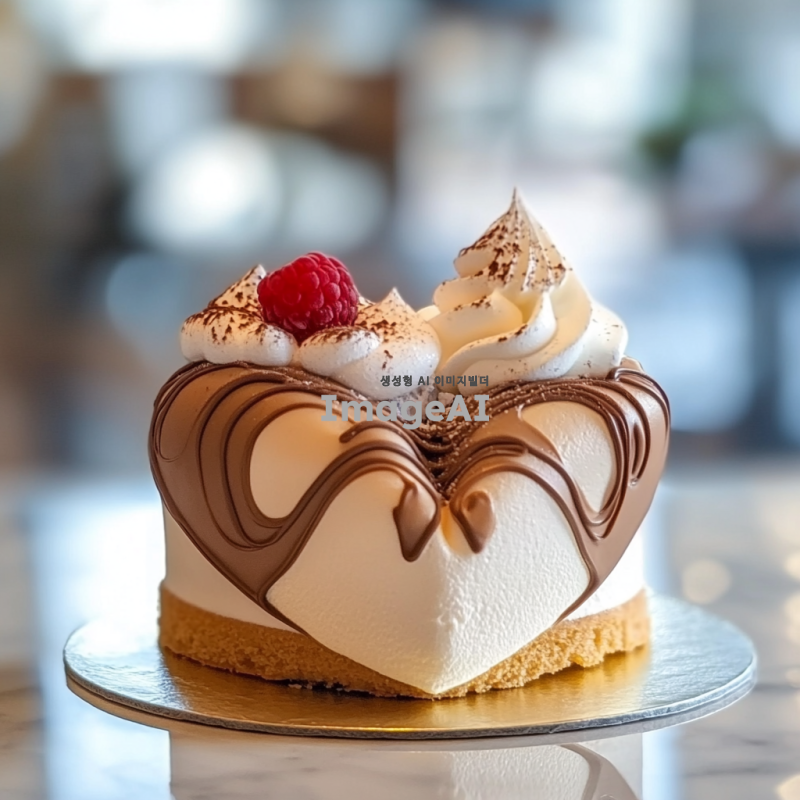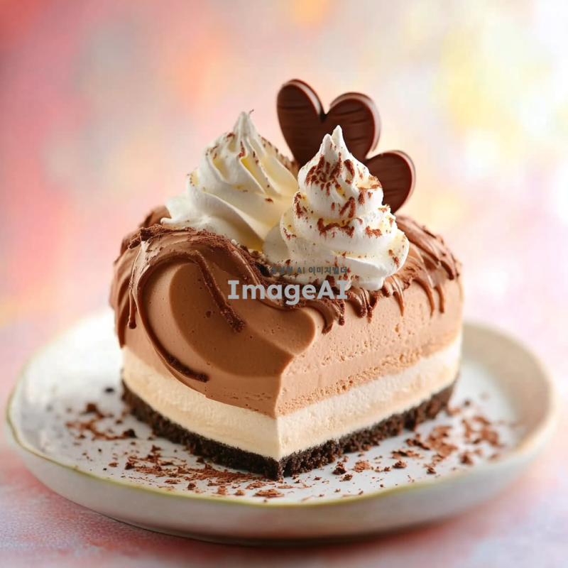 하트 모양의 무스케이크, 부드러운 머랭으로 장식되어 있으며, 초콜릿으로 세련되게 꾸며진 모습. 무스 위에는 작은 크기의 무스 하나가 더 올라가 있는 디저트. 배경은 밝고 아기자기한 느낌으로, 전체적으로 사랑스럽고 달콤한 분위기를 자아내는 이미지.