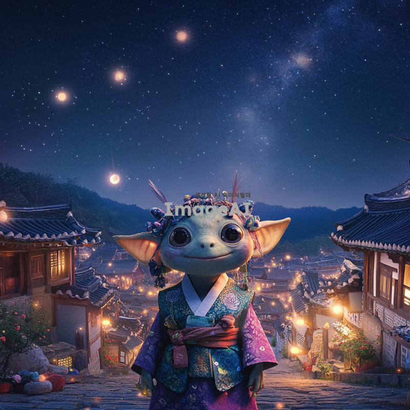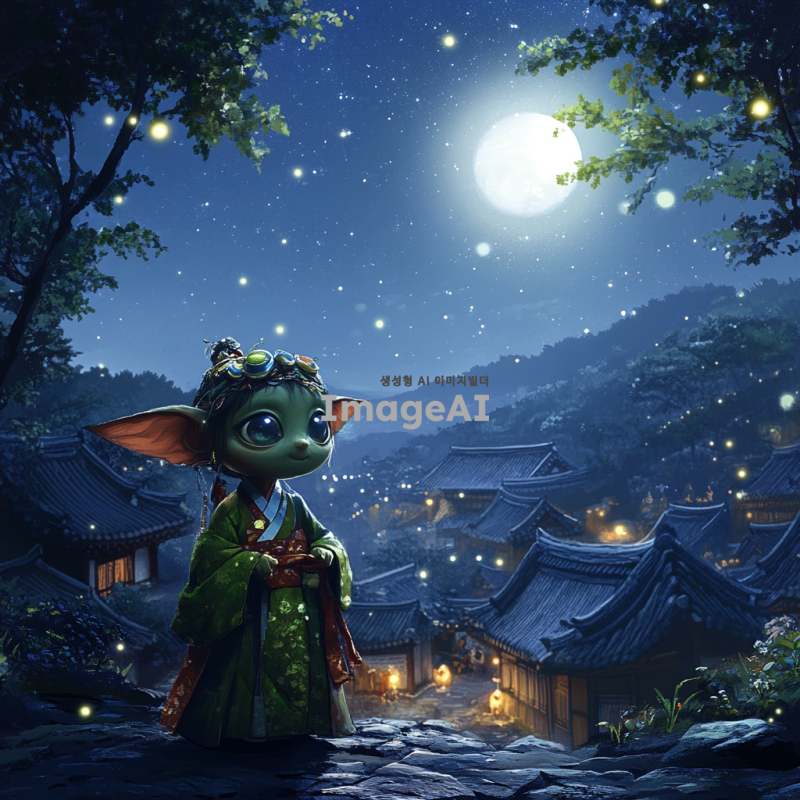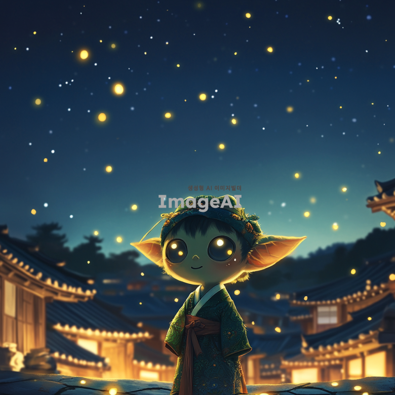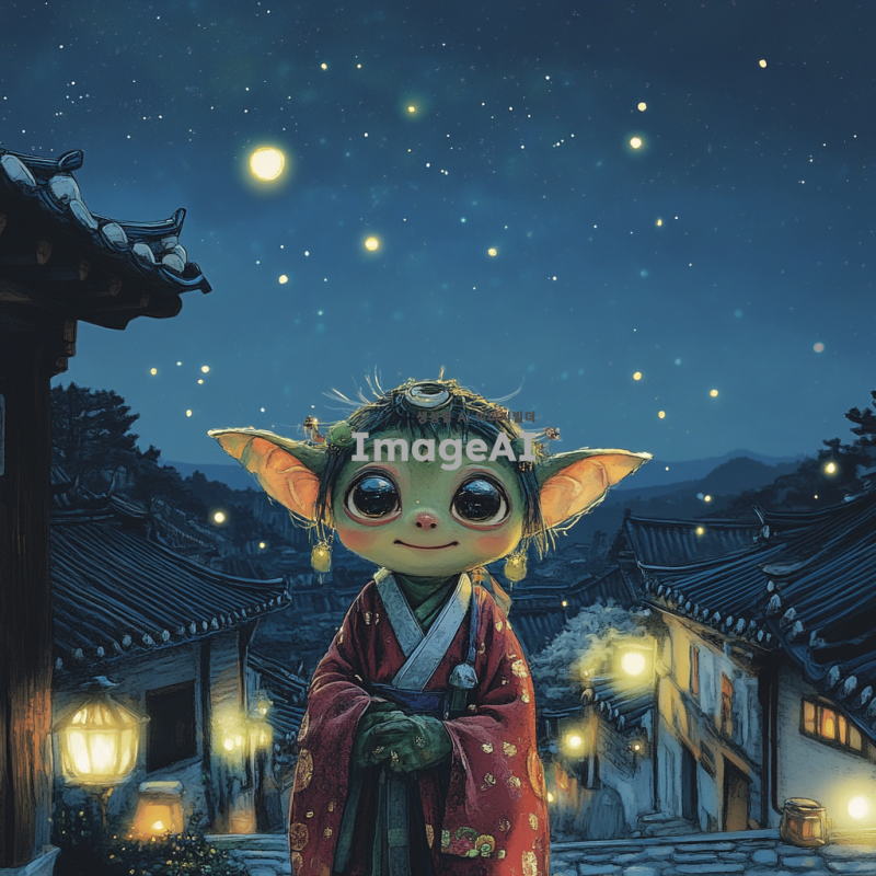 한국 전통의상인 한복을 입고 있는 도깨비가 고요한 밤하늘 아래에서 반짝이는 별들과 함께 서 있는 모습. 도깨비는 장난기 가득한 표정을 짓고 있으며, 주변에는 신비로운 불빛들이 떠다니고 있다. 배경에는 한국 전통 가옥이 보이고, 달빛이 은은하게 비추고 있는 장면.
