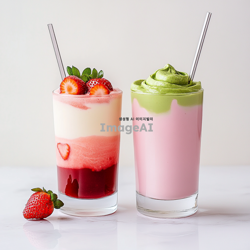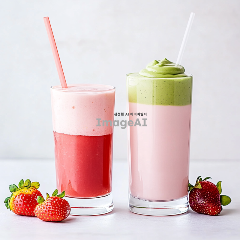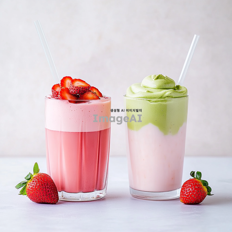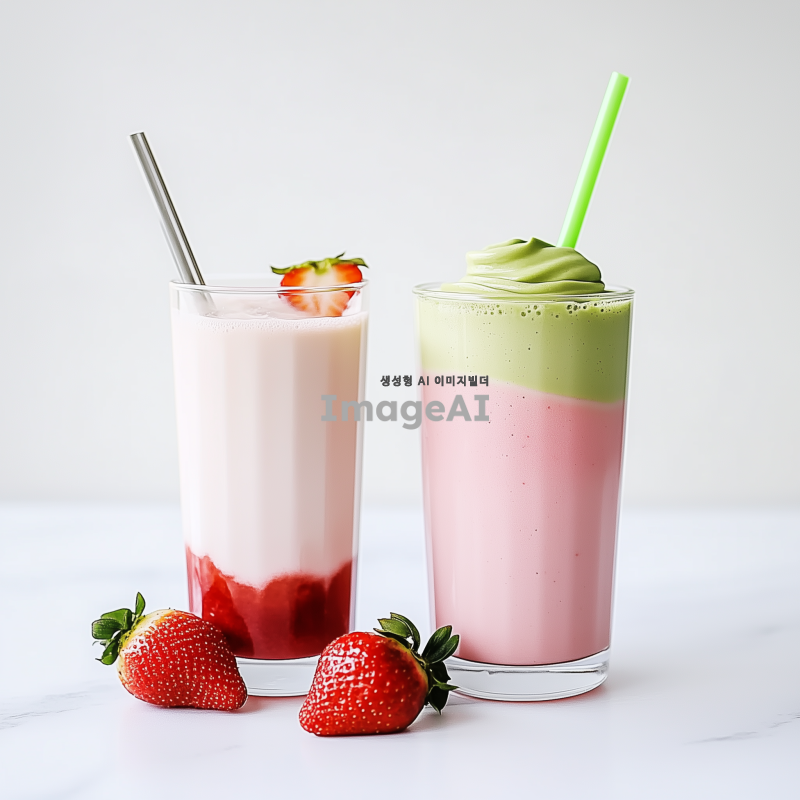 음료 두 잔의 사진, 하나는 딸기소스가 5분의1 깔려있고 그위에는 전부 바나나 우유가 채워져있다. 다른 하나는 분홍색 딸기 우유에 초록색 녹차크림이 부드럽게 얹어져있다. 흰색 배경 위에 놓여 있고, 딸기로 장식되어 있으며, 각 잔에 빨대가 꽂혀 있다. 연한 회색 단색 배경에서 정면에서 촬영되었고, 캐논 EOS 카메라로 자연광을 이용해 촬영되었다.
