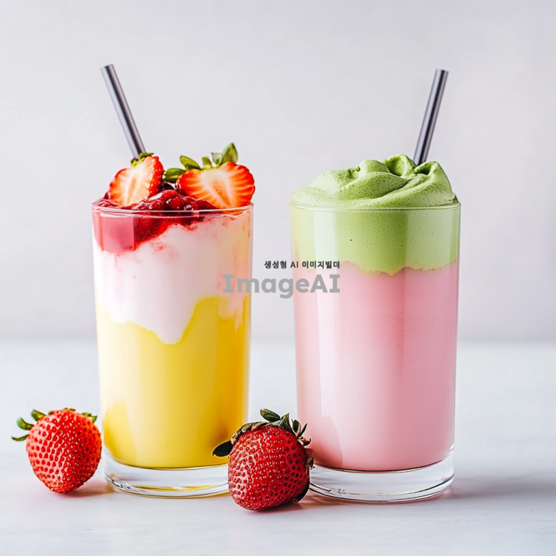 음료 두 잔의 사진, 하나는 딸기소스가 5분의1 깔려있고 그위에는 전부 샛노란 바나나 우유가 채워져있다. 다른 하나는 분홍색 딸기 우유에 초록색 녹차크림이 부드럽게 얹어져있다. 흰색 배경 위에 놓여 있고, 딸기로 장식되어 있으며, 연한 회색 단색 배경에서 정면에서 촬영되었고, 캐논 EOS 카메라로 자연광을 이용해 촬영되었다.