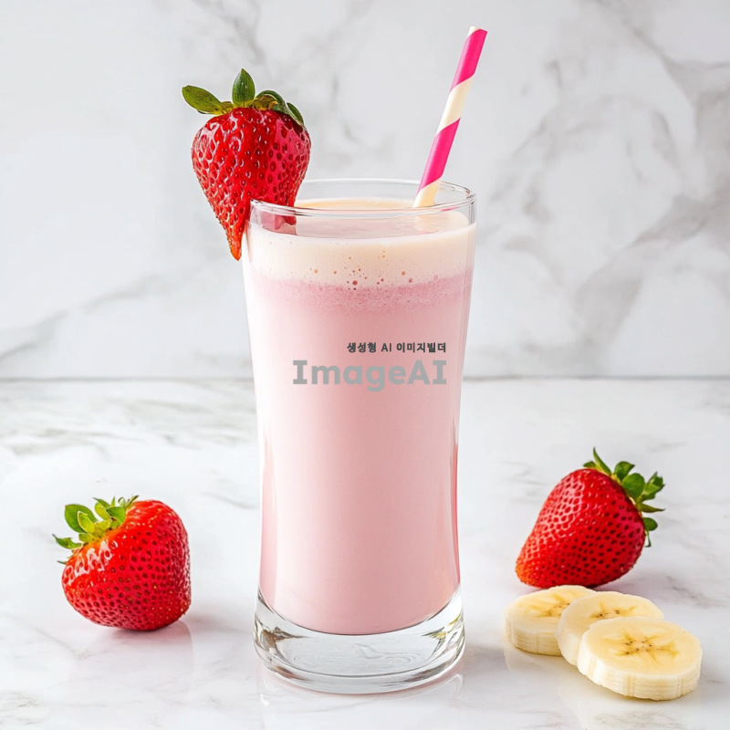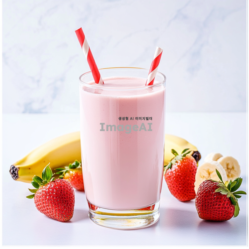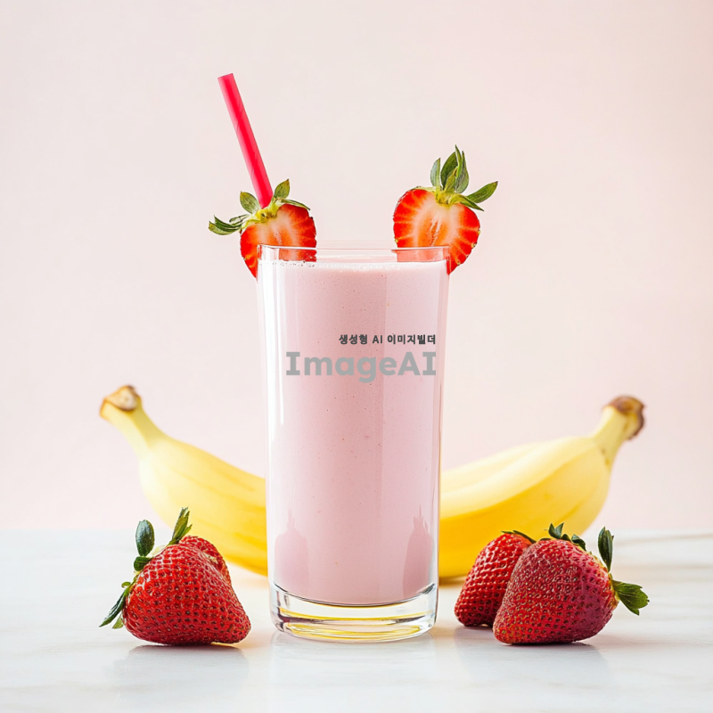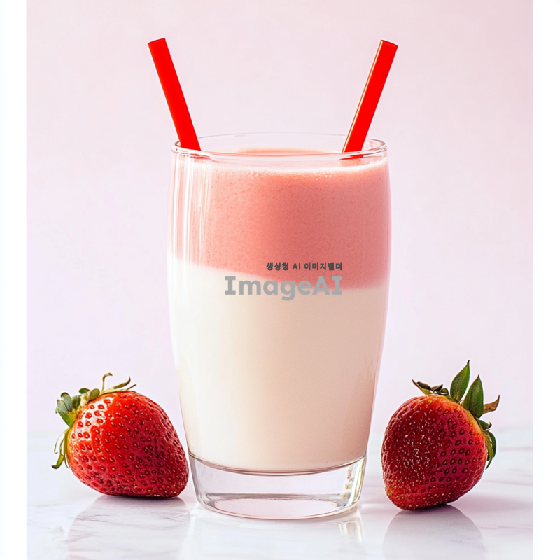 유리컵에 담긴 음료의 사진, 컵의 30%는 딸기청으로 채워져 있고 나머지 70%는 바나나우유가 가득차있다 전체적으로 밝고 깨끗한 이미지