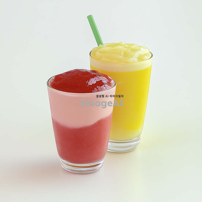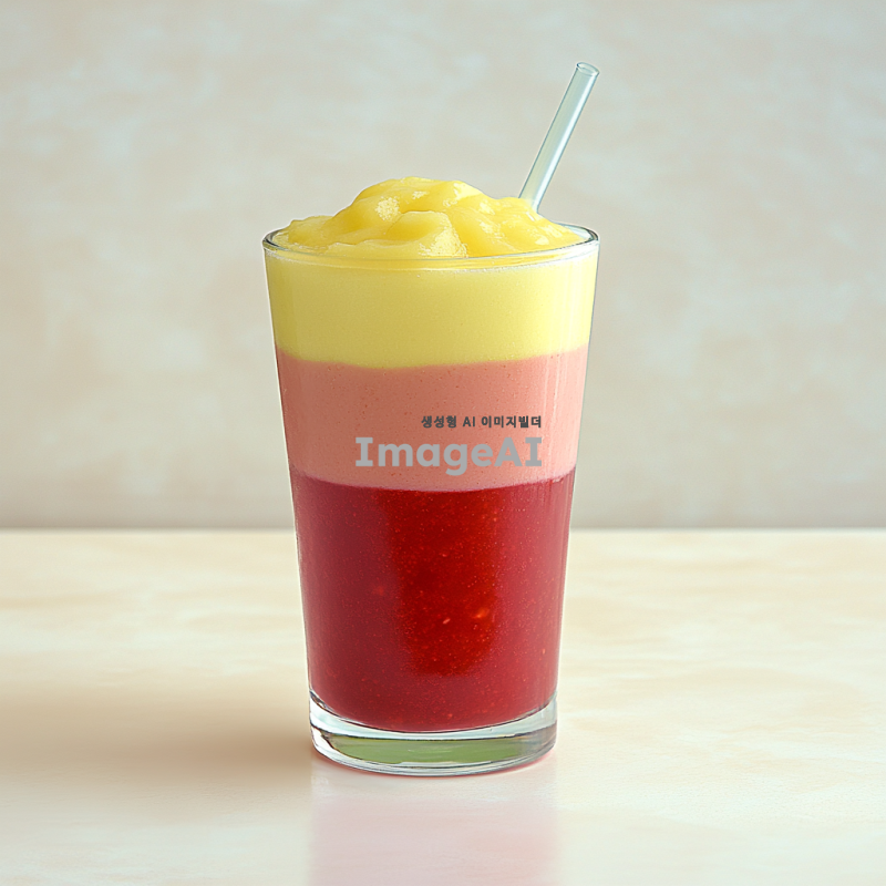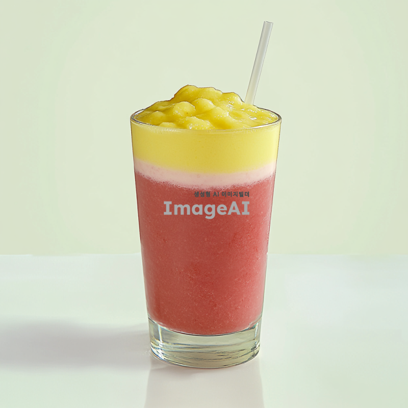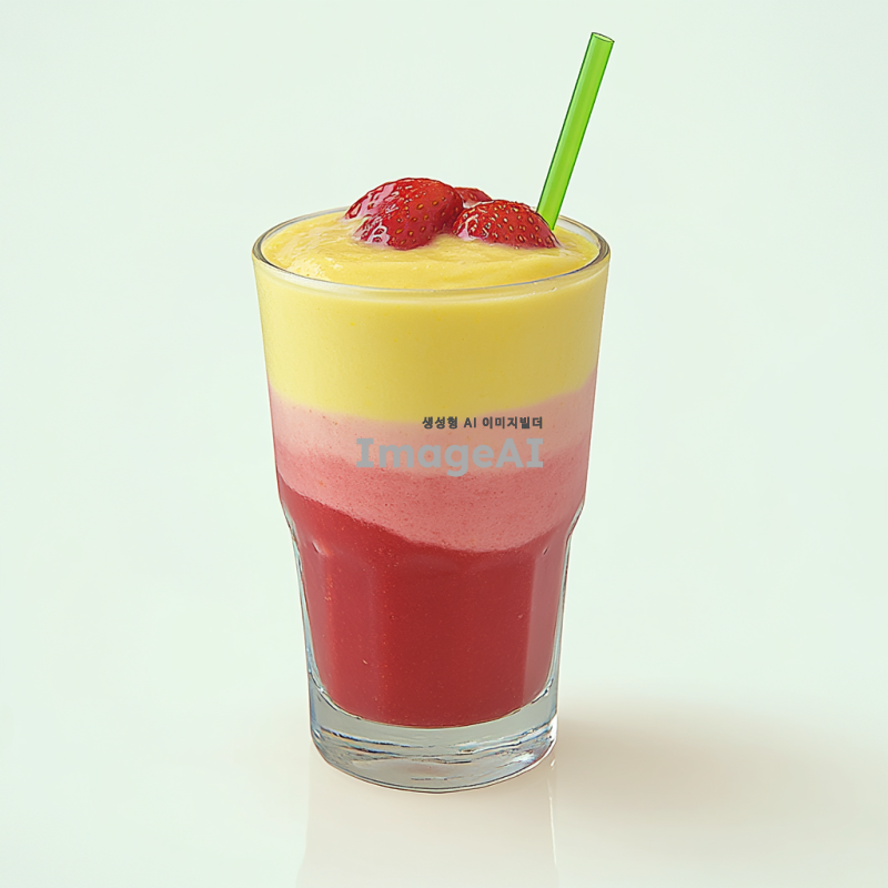 유리컵에 담긴 음료의 사진, 컵안 바닥에 20%는 딸기과육이 있는 딸기소스가 바닥에 깔려있고 윗 공간의 80%는 샛노란 바나나우유와 얼음이 가득 차 있다. 두 층이 강조되어 더 맛있어보인다. 전체적으로 밝고 깨끗한 이미지, 컵에 음료만 담겨있고 빨대나 과일은 사진에 없다.