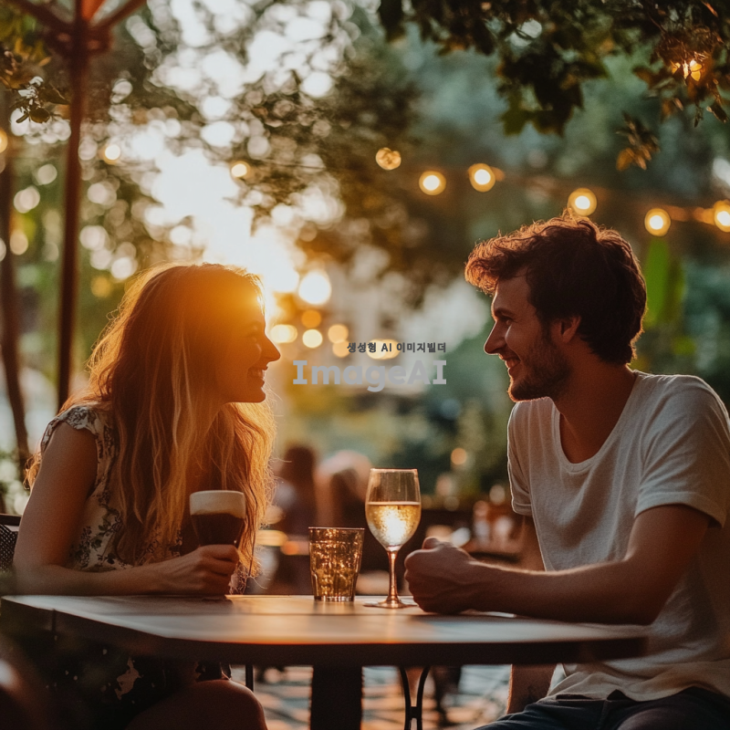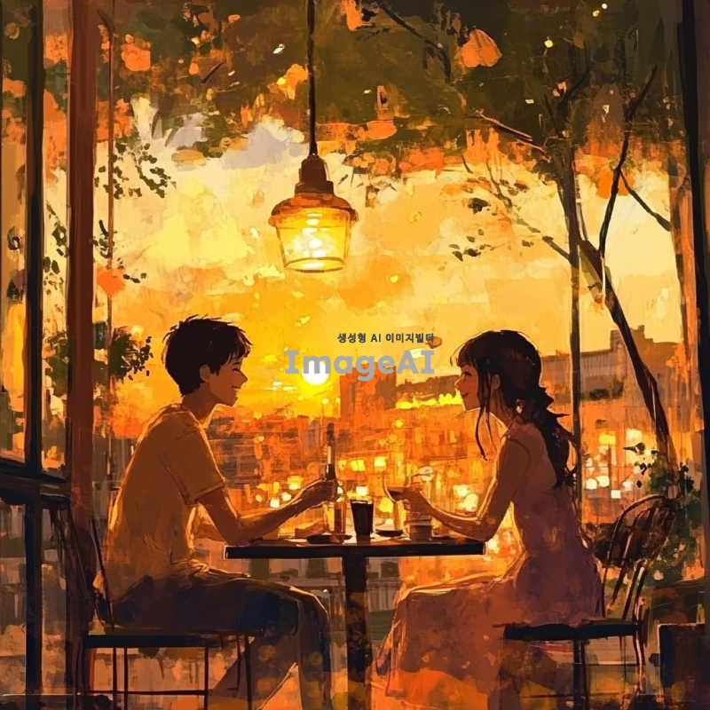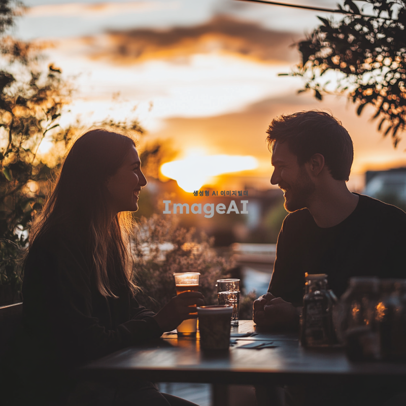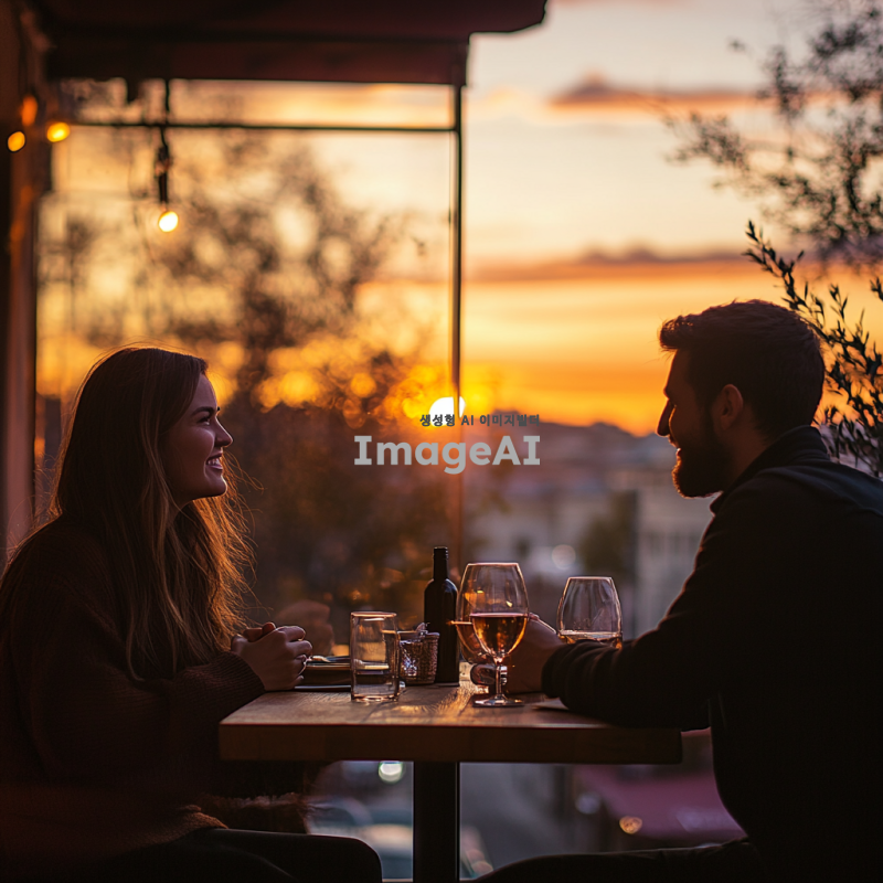 사랑하는 사람과 함께하는 따뜻한 저녁, 두 사람이 서로를 바라보며 미소 지으며 손을 잡고 있는 모습, 배경에는 노을이 지는 아름다운 풍경, 감정이 가득한 눈빛과 사랑스러운 분위기, 아늑한 카페 테라스에서의 순간.