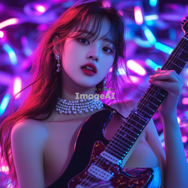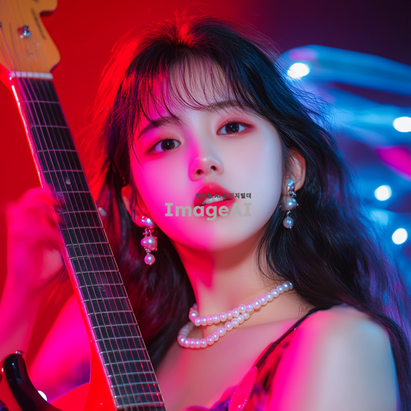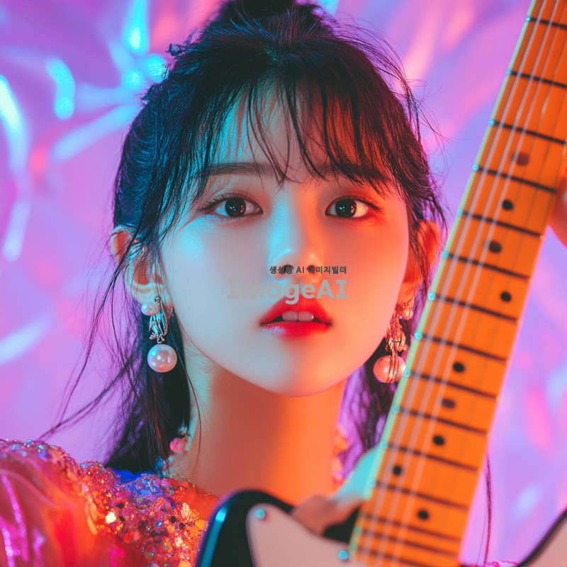 일렉기타를 들고 있는 진주 귀걸이를 한 한국 소녀, 밝은 표정과 에너지 넘치는 포즈, 현대적인 배경, 화려한 색감, 음악을 즐기는 분위기, 패셔너블한 의상, 일렉기타의 디테일이 잘 보이도록.