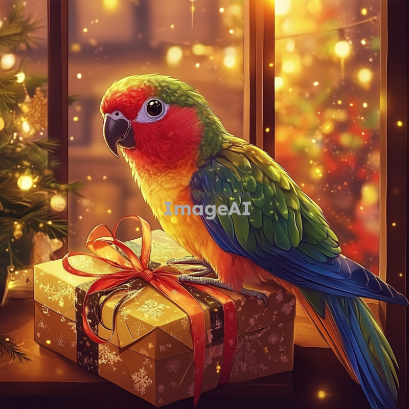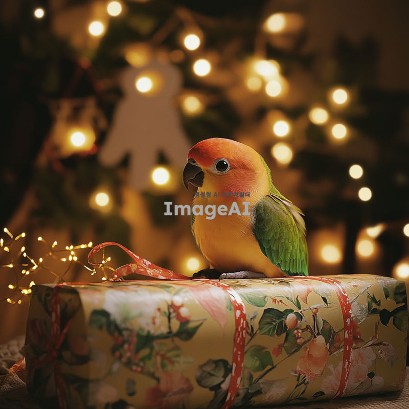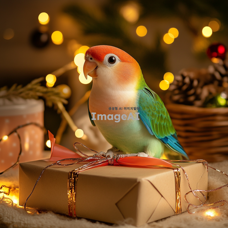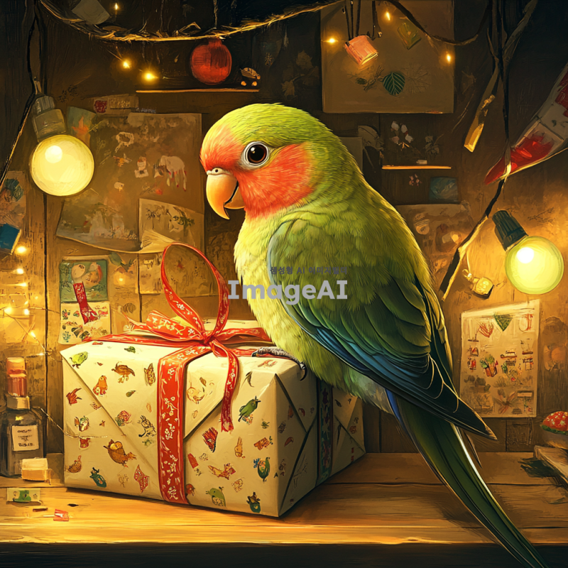 한국의 전통적인 포토카드 포장을 하는 앵무새, 화려한 색상의 깃털을 가진 앵무새가 포장지 위에 앉아 있는 모습, 아기자기한 디자인의 포장지와 리본이 함께 있는 장면, 따뜻한 조명이 비추는 아늑한 분위기, 귀여운 스타일의 일러스트레이션.