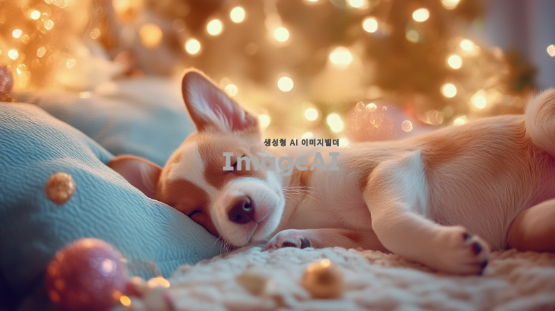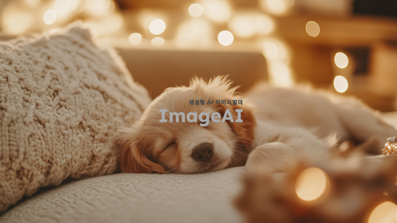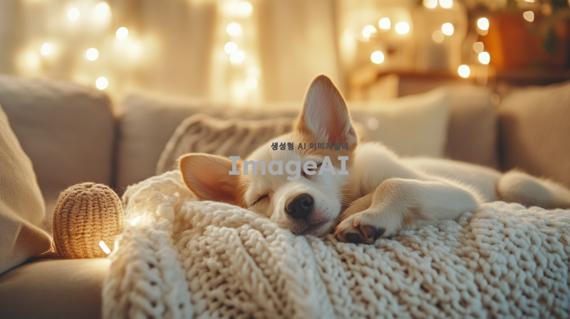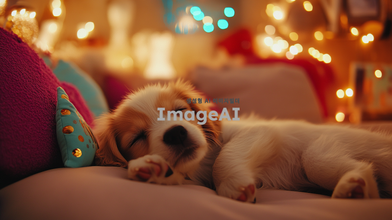 강아지가 아늑한 소파 위에 편안하게 누워있는 모습, 부드러운 조명 아래 따뜻한 분위기, 소파의 색상은 파스텔 톤으로, 강아지는 귀여운 표정으로 눈을 감고 있는 모습, 주변에는 아기자기한 인테리어 소품들이 배치되어 있는 장면.