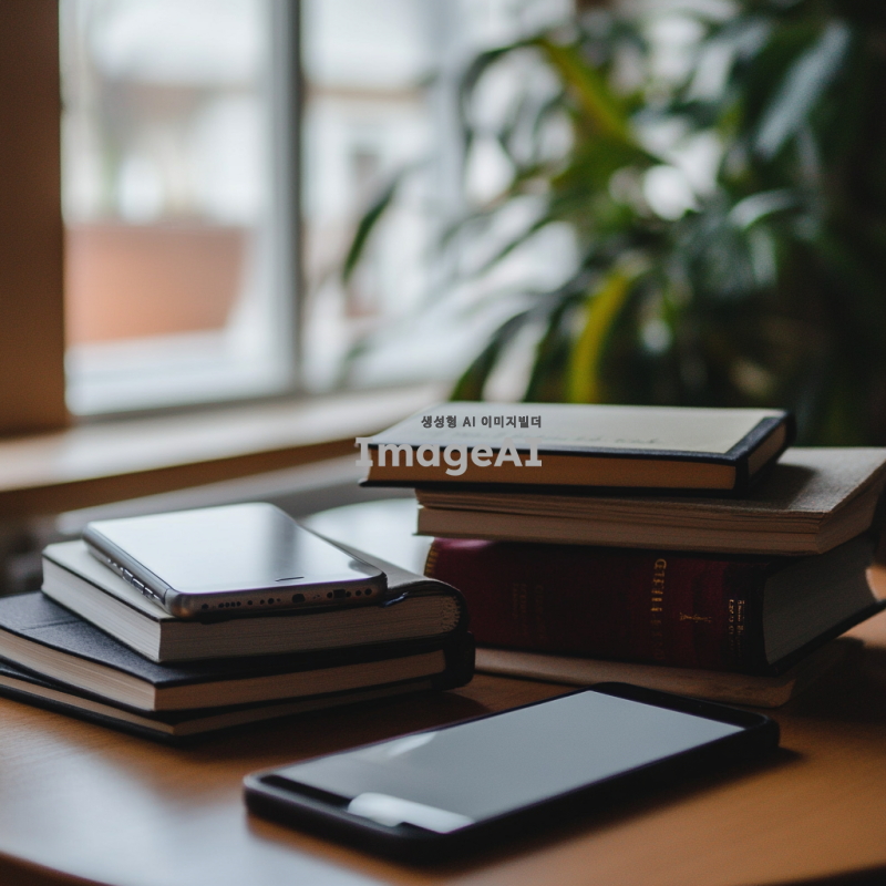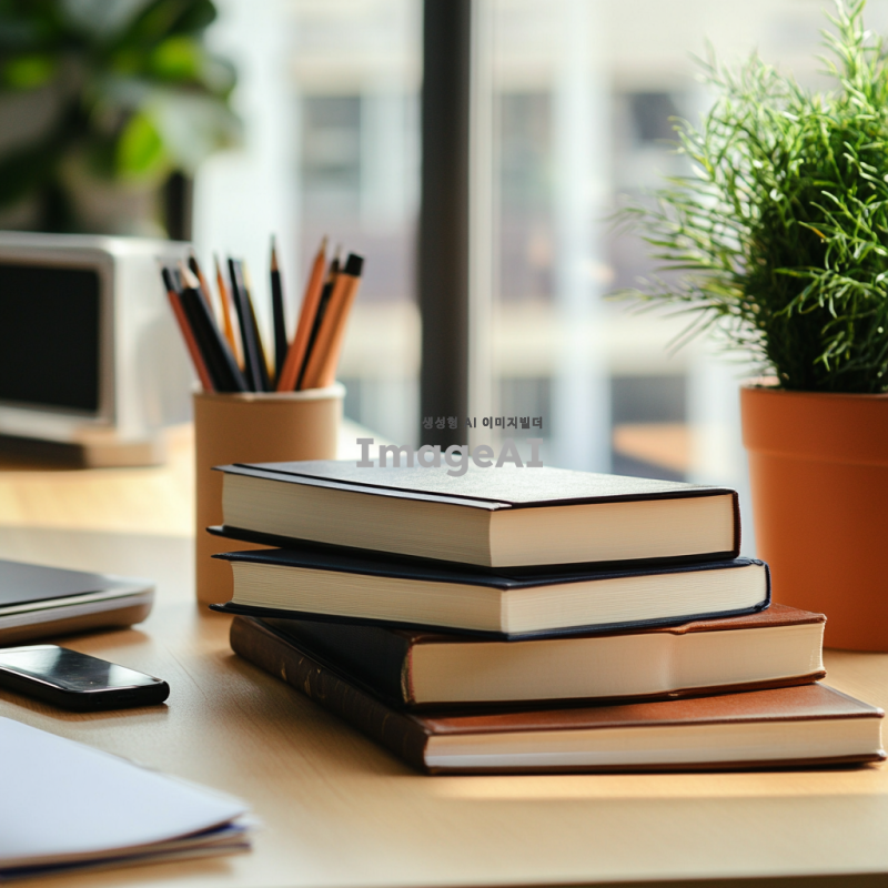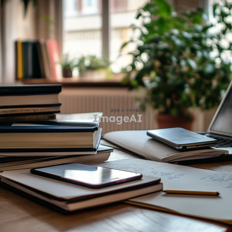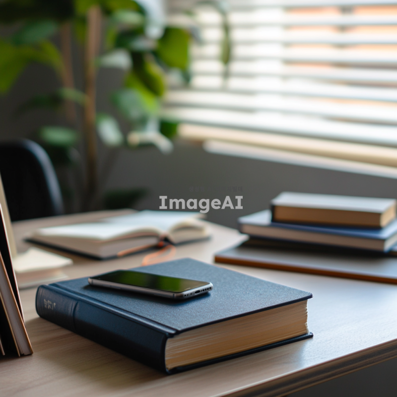 책상위에 책과 휴대전화가 놓여있고 메모할 준비가 되어 있다