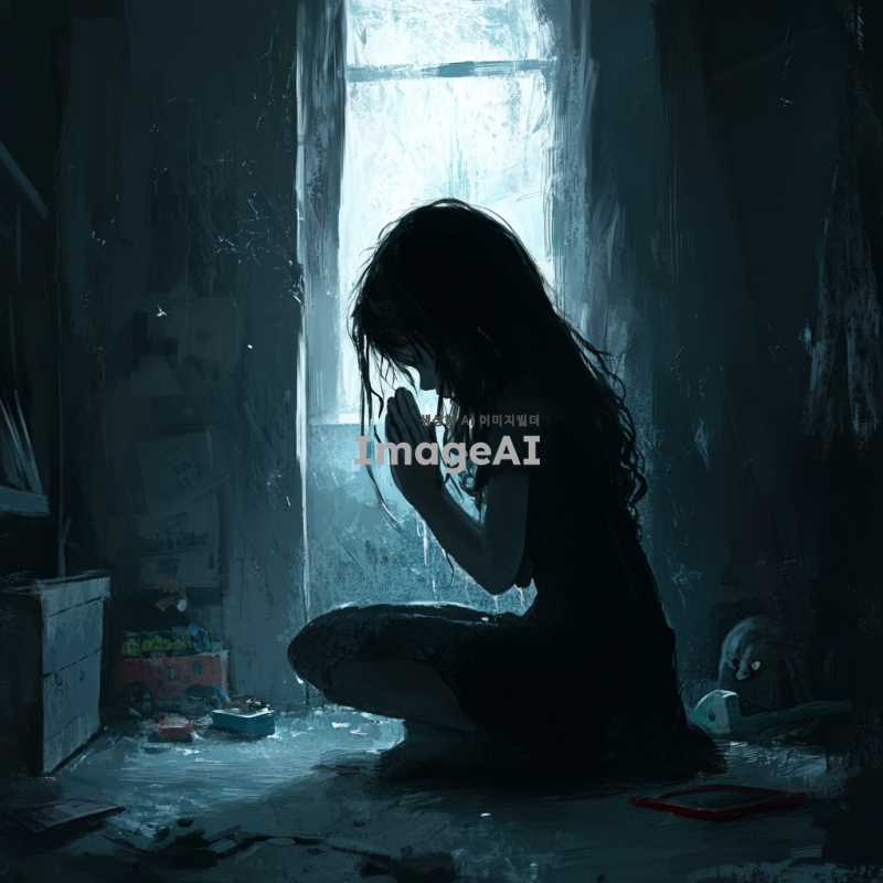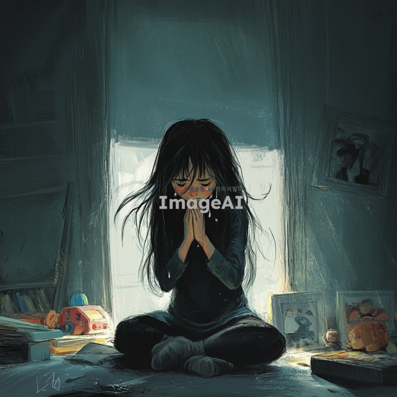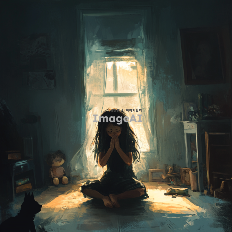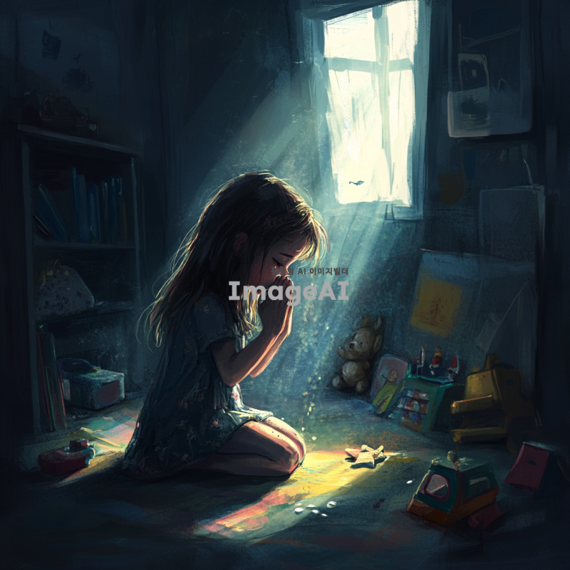 부모님의 싸우는 소리 너머 방 안에서 무릎 꿇고 기도하고 있는 여자아이의 모습. 그녀는 긴 생머리를 가지고 있으며, 눈에는 눈물이 고여 있다. 방은 어둡고, 창문으로 들어오는 희미한 빛이 그녀의 얼굴을 비추고 있다. 주변에는 장난감과 책들이 어지럽혀져 있고, 그녀의 손은 기도하는 자세로 모아져 있다. 여자아이의 표정은 간절함과 슬픔이 섞여 있다.