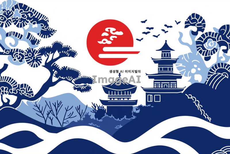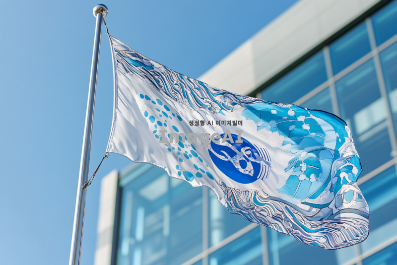 건축학과의 깃발 디자인, 현대적이고 창의적인 요소를 포함한 스타일, 한국 전통 문양과 현대 건축 요소의 조화, 깃발의 색상은 파란색과 흰색을 기본으로 하며, 중앙에 건축학과의 상징적인 아이콘을 배치, 배경은 간결하고 세련된 느낌으로, 전체적으로 전문적이고 학문적인 분위기를 강조.