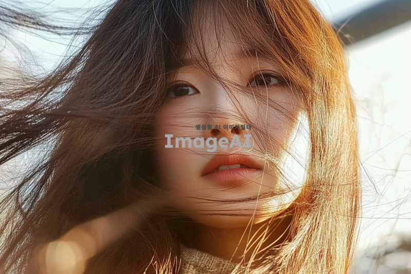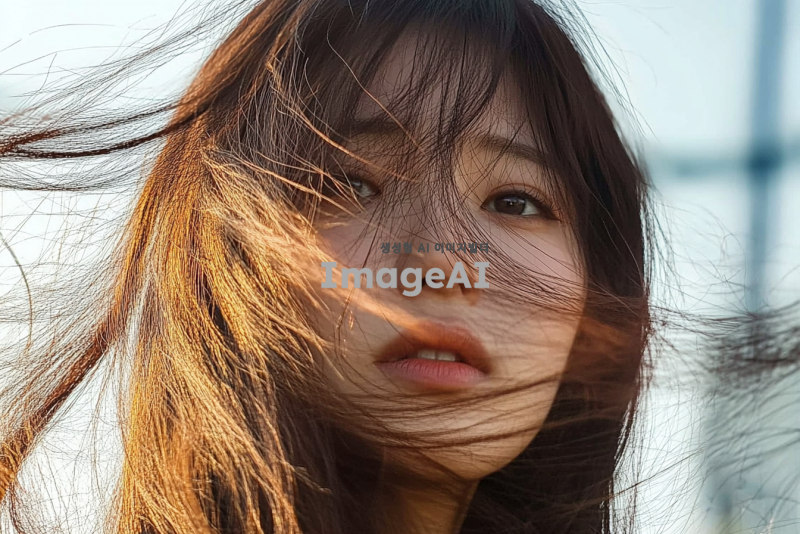 세찬 바람에 긴 머리카락이 흩날리며 정면을 응시하는 아름다운 한국 여성의 얼굴, 머리카락의 일부가 얼굴을 가리고 있는 모습, 자연광이 비치는 배경, 감성적인 분위기