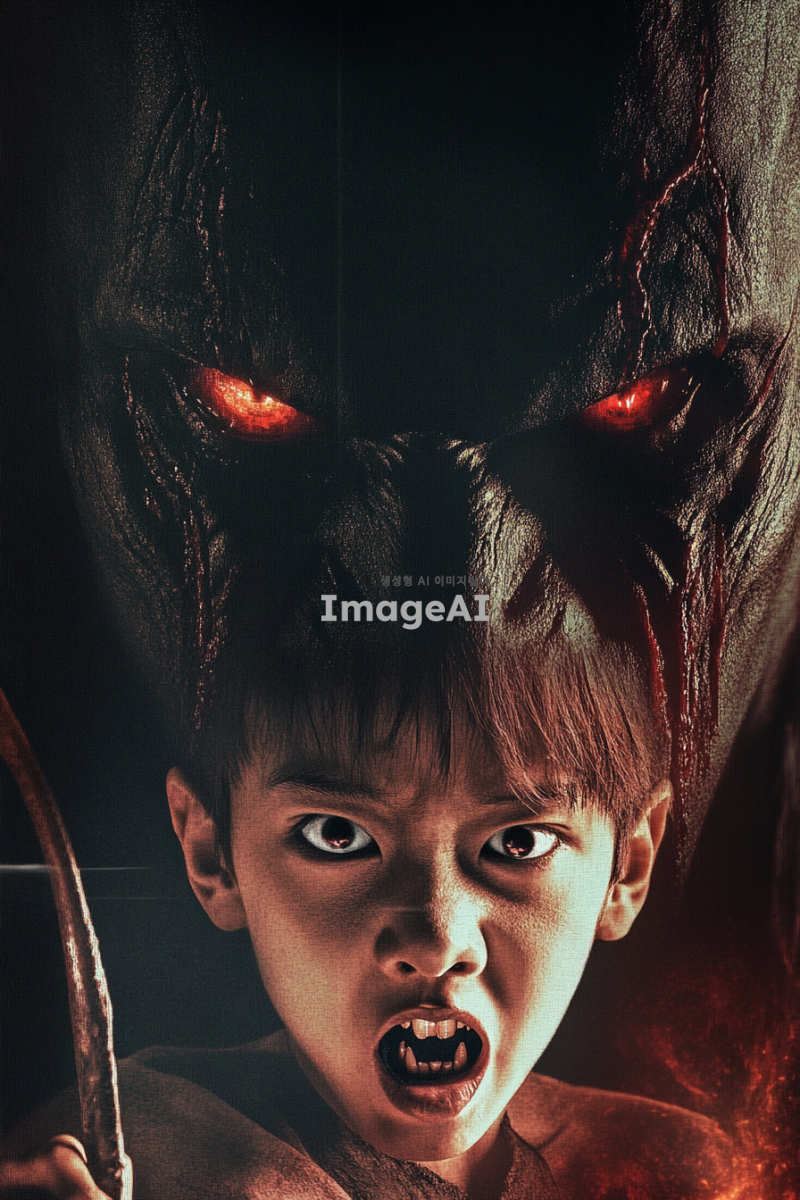 이재명과 악마의 눈이 합성된 모습, 어린 사악한 아이가 낫을 들고 있는 영화 포스터 디자인. 어두운 배경에 긴장감 넘치는 분위기, 강렬한 색감과 독특한 타이포그래피로 제목을 강조. 아이의 표정은 악의와 장난기가 가득하며, 이재명의 특징적인 얼굴이 악마의 눈과 조화를 이루는 이미지. 전체적으로 신비롭고 음산한 느낌을 주는 포스터.