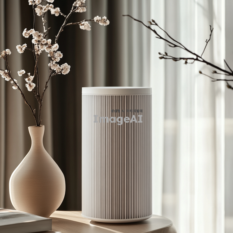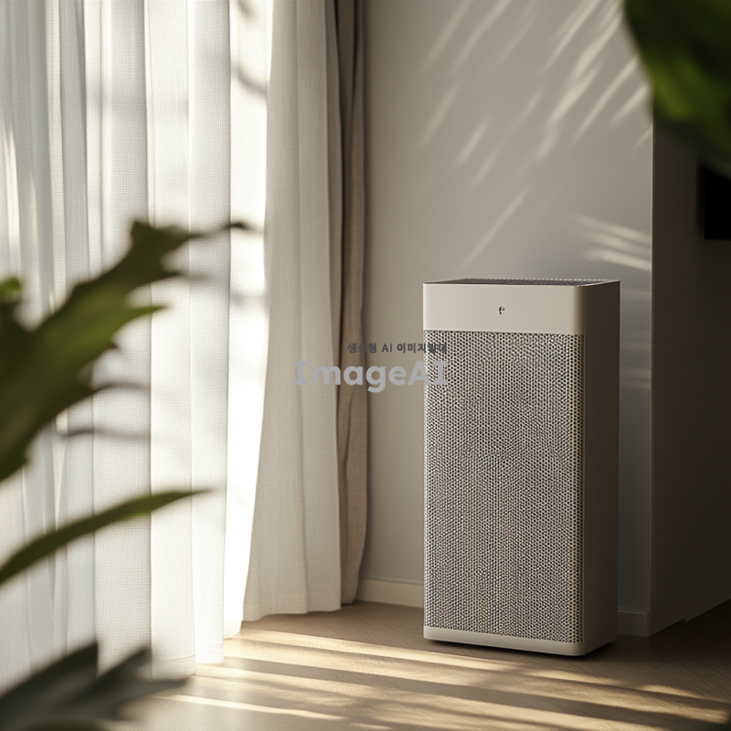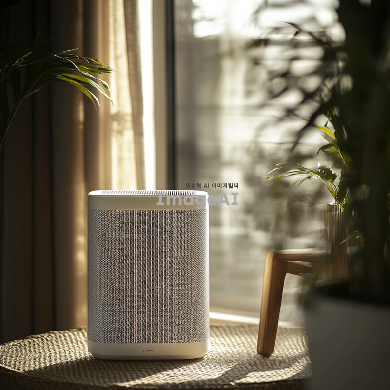 깨끗한 공기를 위한 고효율 공기청정기 필터, 현대적이고 세련된 디자인, 필터의 세부 구조가 강조된 모습, 자연 친화적인 요소와 함께 조화롭게 배치된 실내 환경, 부드러운 조명 아래에서 필터의 기능성과 아름다움이 돋보이는 장면.