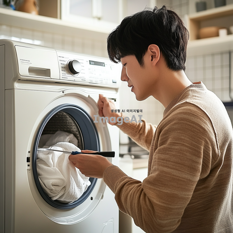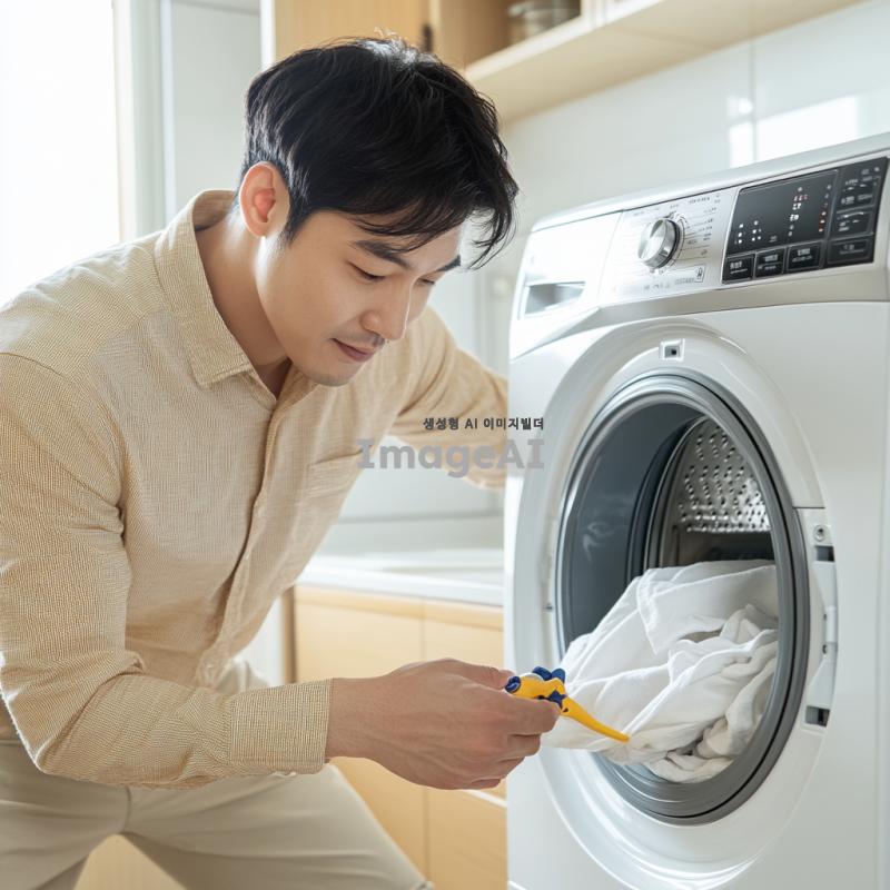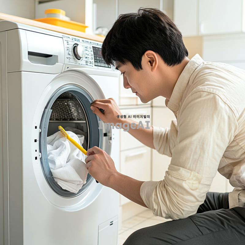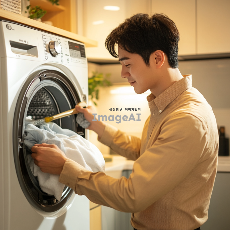 세탁기 내부를 청소하는 한국인 남성의 모습, 세탁기 문을 열고 내부를 점검하며 청소 도구를 사용하는 모습, 깨끗하고 정돈된 주방 배경, 자연광이 들어오는 밝은 분위기, 청소에 집중하는 표정, 세탁기 내부의 세탁물과 청소 도구들이 잘 보이도록 구성.