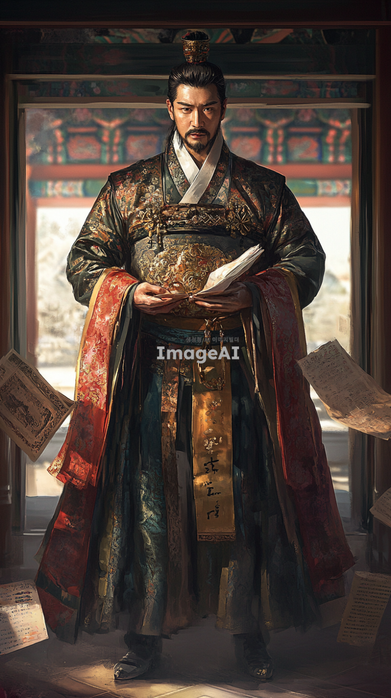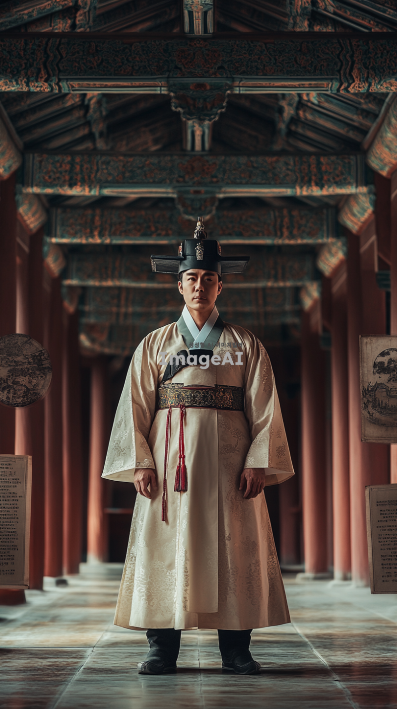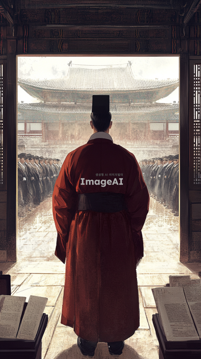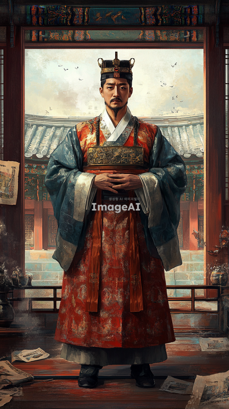 1392년 세종대왕의 시점에서의 이야기를 생생하게 전달하는 이미지. 세종대왕이 조선 왕조의 초창기 혼란과 책임감, 결단력을 느끼고 있는 순간을 포착. 전통 한복을 입고, 궁궐 내부에서 고민하는 표정으로 서 있는 모습. 배경에는 고풍스러운 궁궐의 구조와 당시의 역사적 분위기를 담아내고, 세종대왕의 내면적인 감정을 강조하는 요소들을 추가. 그의 주변에는 역사적 상징물이나 문서가 놓여 있어 지식과 배움에 대한 열망을 나타냄.