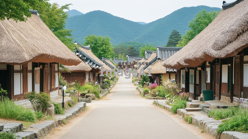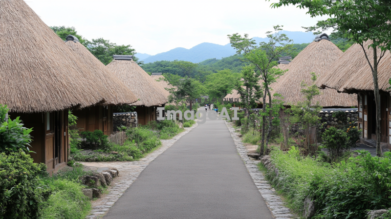 조선시대 서민 초가집이 늘어선 거리 풍경. 전통적인 한국의 초가집들이 나란히 서 있고, 그 사이로 좁은 길이 이어져 있는 모습. 주변에는 푸른 자연이 어우러져 있고, 멀리 산이 보인다. 사람은 거의 없거나 아주 조금 등장하여 조용한 분위기를 강조. 전체적으로 한국의 전통적인 느낌이 잘 드러나도록.