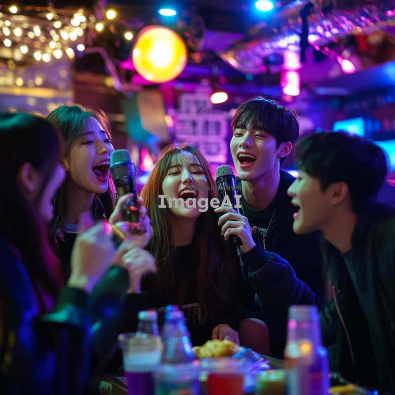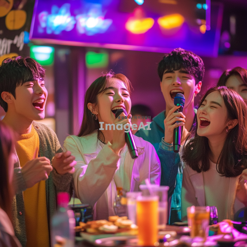 한국의 인기 있는 노래방에서 친구들과 함께 즐겁게 노래를 부르는 모습. 다채로운 조명과 화려한 인테리어가 돋보이는 공간에서, 다양한 음료와 간식이 놓여 있는 테이블 주위에 모여 있는 젊은 사람들. 모두가 신나는 표정으로 마이크를 들고 열창하는 장면, 배경에는 유명한 히트곡의 가사와 음악이 흐르고 있는 분위기.