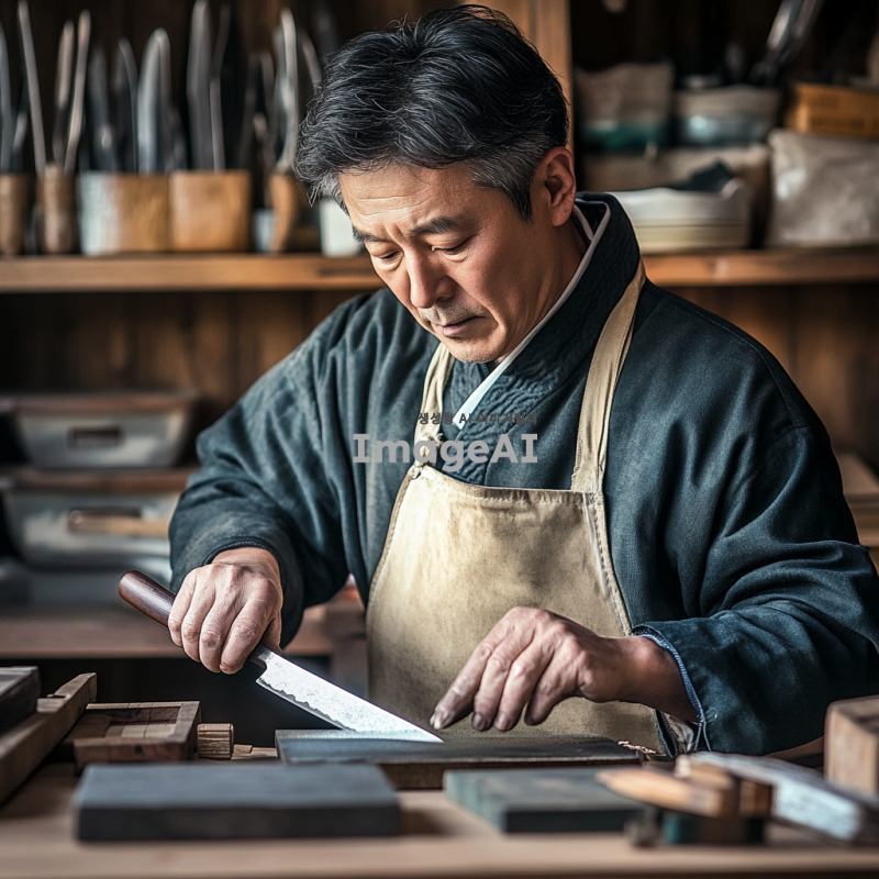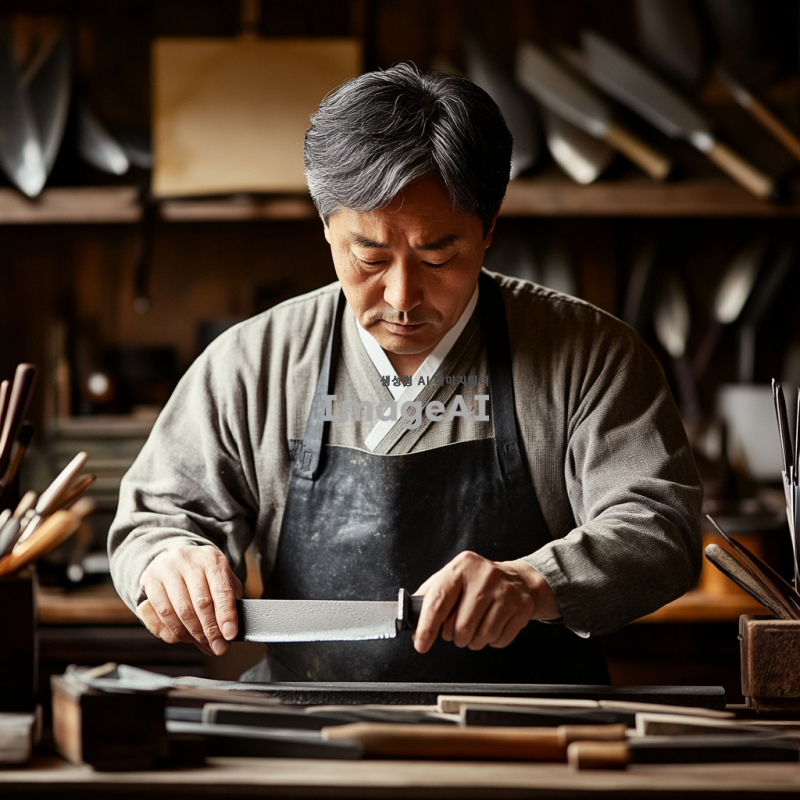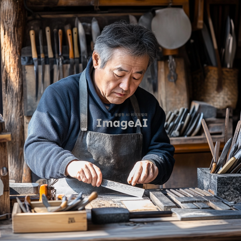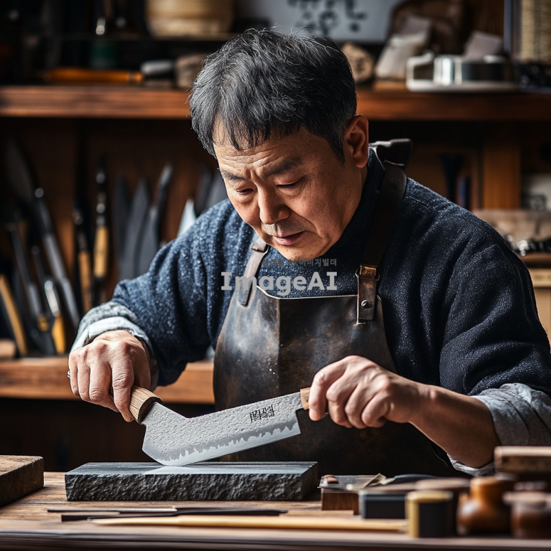 숫돌 위에서 칼을 갈고 있는 한국 남성의 모습, 집중한 표정, 주변에는 칼과 숫돌이 잘 배치되어 있고, 자연광이 들어오는 작업실의 분위기, 전통적인 한국의 도구와 장비가 함께 있는 장면.
