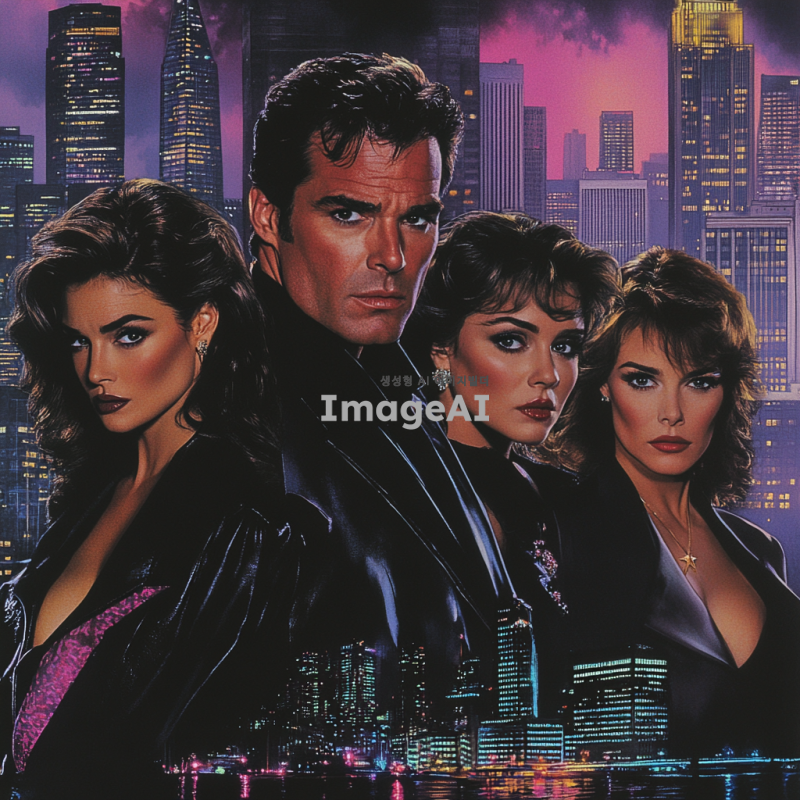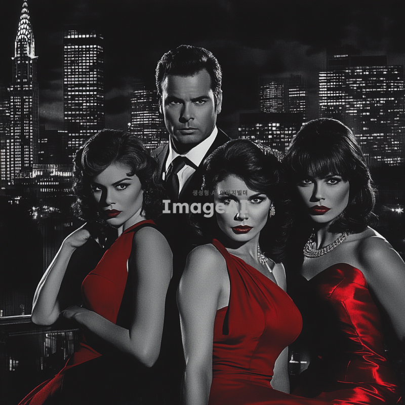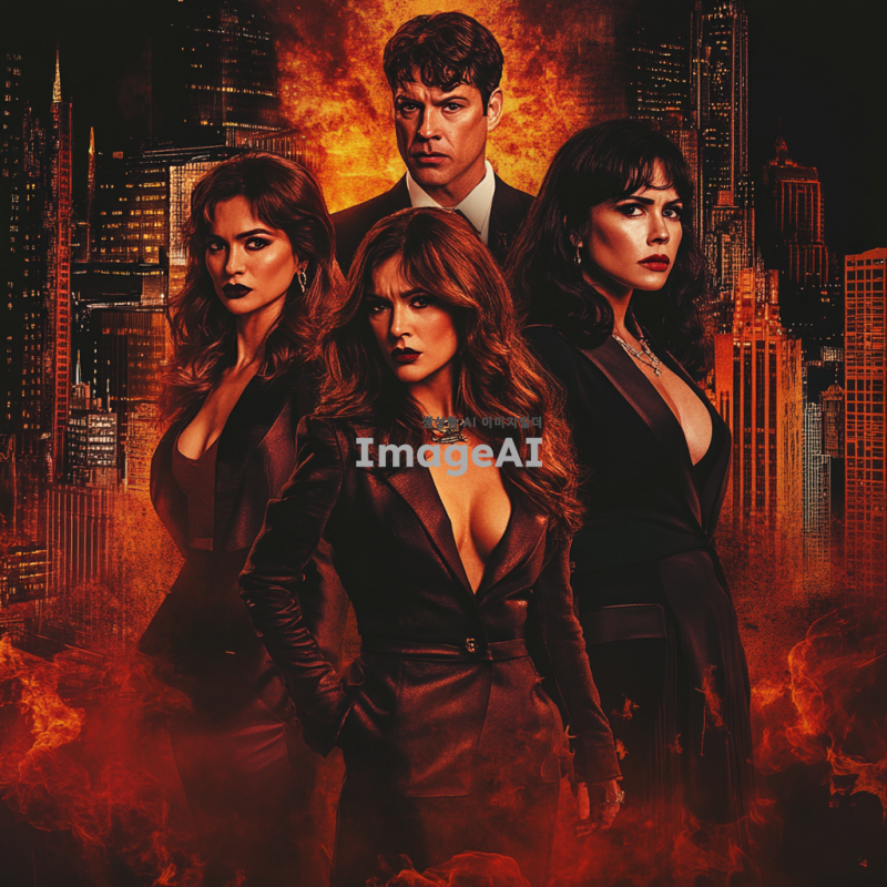 남자 한 명과 여자 세 명이 등장하는 막장 미국 드라마 포스터, 긴장감 넘치는 표정과 다양한 감정이 담긴 모습, 화려한 도시 배경, 어두운 조명과 대비가 뚜렷한 색감, 드라마틱한 분위기, 각 캐릭터의 개성이 드러나는 의상과 포즈, 강렬한 타이틀과 슬로건이 적힌 디자인 요소 포함