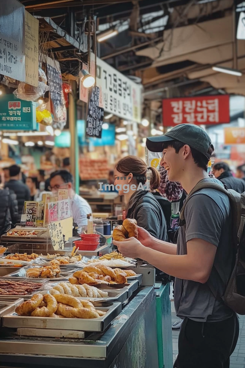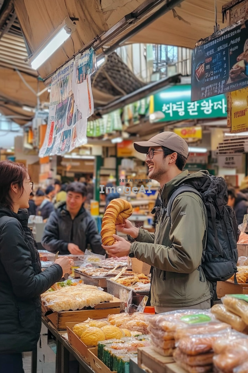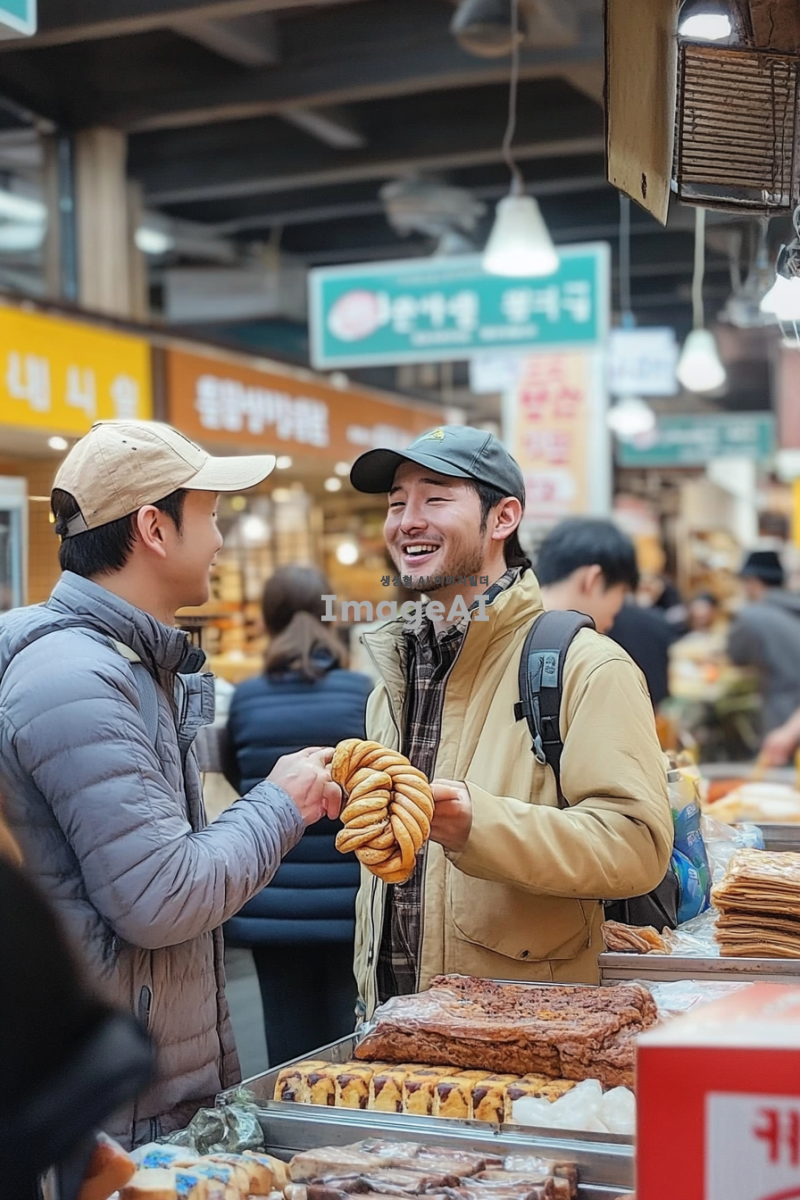 한국의 전통 시장을 방문한 외국인들이 서로를 보며 밝게 웃고 있는 장면. 한 외국인 남자는 20대이며 가벼운 등산복을 입고 등산 모자를 쓰고 있다. 그는 손에 꽈배기를 들고 맛있게 먹고 있다. 20대 여성은 환하게 웃고 있으며, 40대 부부는 시장 상인들과 대화를 나누고 있는 모습이 담겨 있다. 시장의 다양한 상품과 활기찬 분위기가 배경에 어우러져 있다.