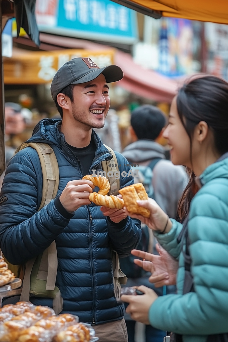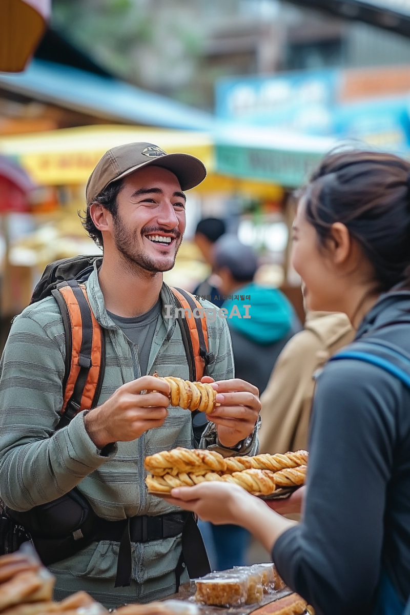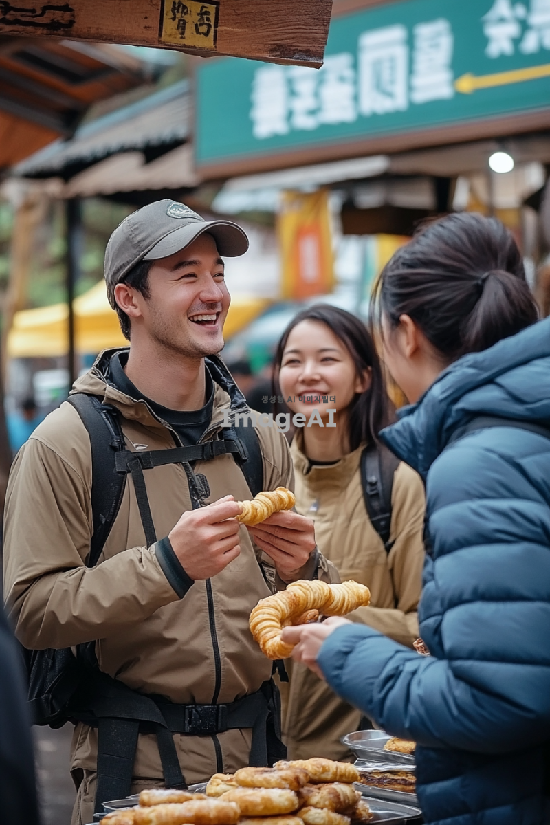 재래 시장에서 가벼운 등산복을 입고 있는 20대 서양 남성이 등산 모자를 쓰고 꽈배기를 먹고 있으며, 그 모습을 보며 밝게 웃고 있는 20대 동양 여성과 상인들과 이야기하는 40대 서양 부부가 함께 있는 장면.