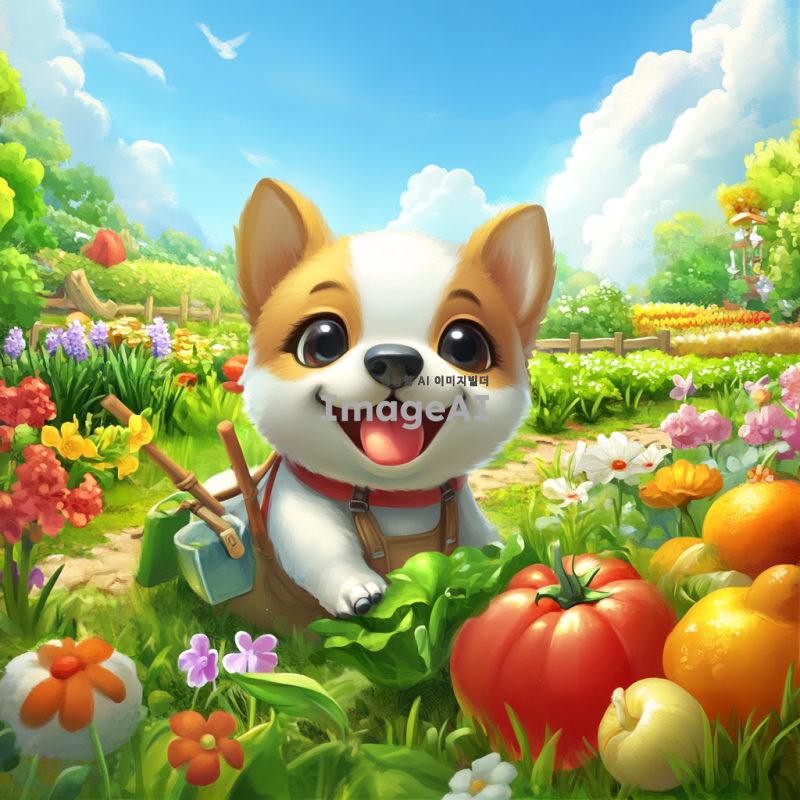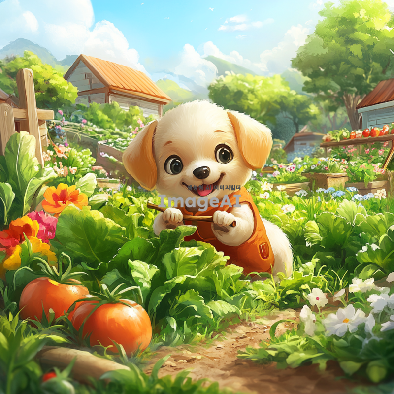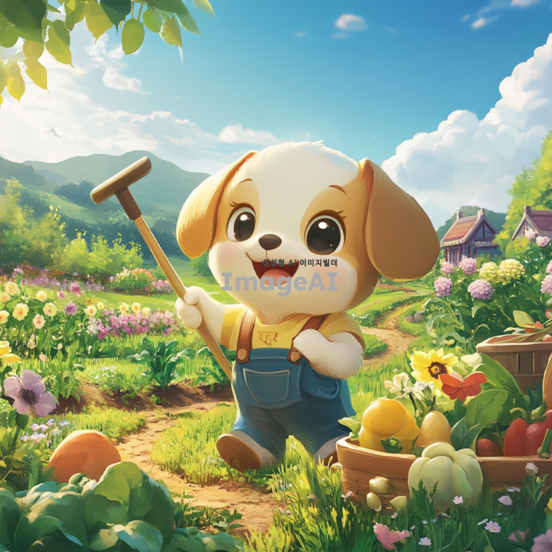 농사짓는 한국 강아지가 푸른 들판에서 작물을 돌보며 일하는 모습, 강아지가 작은 농기구를 사용하고, 햇볕이 잘 드는 날씨 아래 다양한 채소와 꽃들이 만발한 배경, 강아지의 표정은 즐겁고 활기차며, 농사 작업을 돕는 모습이 귀엽고 사랑스럽게 표현된 장면.