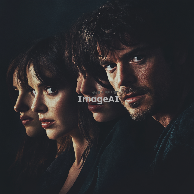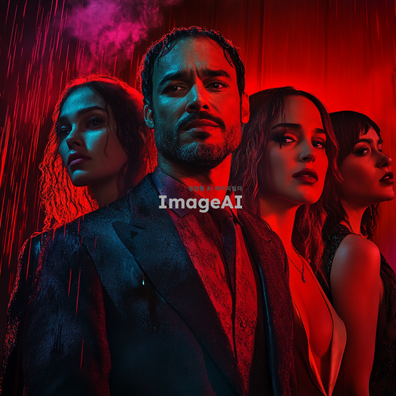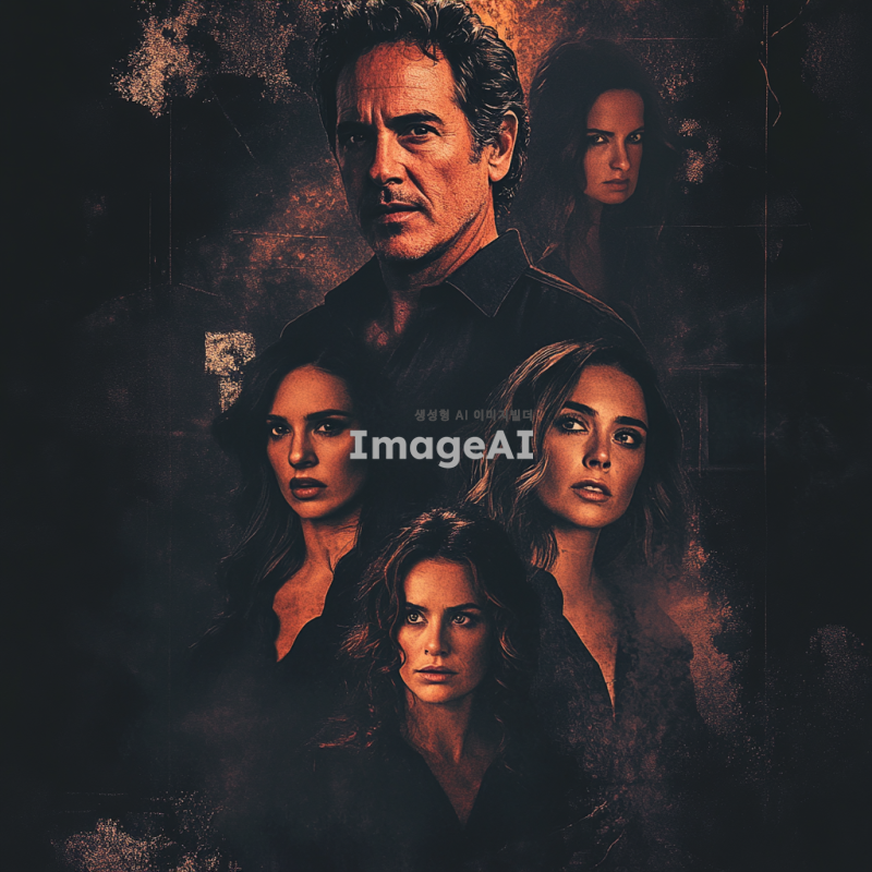 남자 한 명과 여자 세 명이 등장하는 미국 드라마 포스터, 남자는 코웃음, 여자들은 다양한 감정이 담긴 모습. 트렌디하고 어두운 분위기.