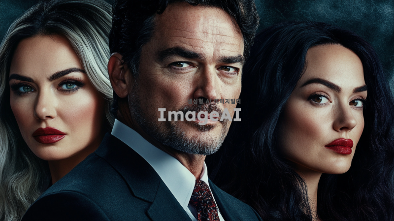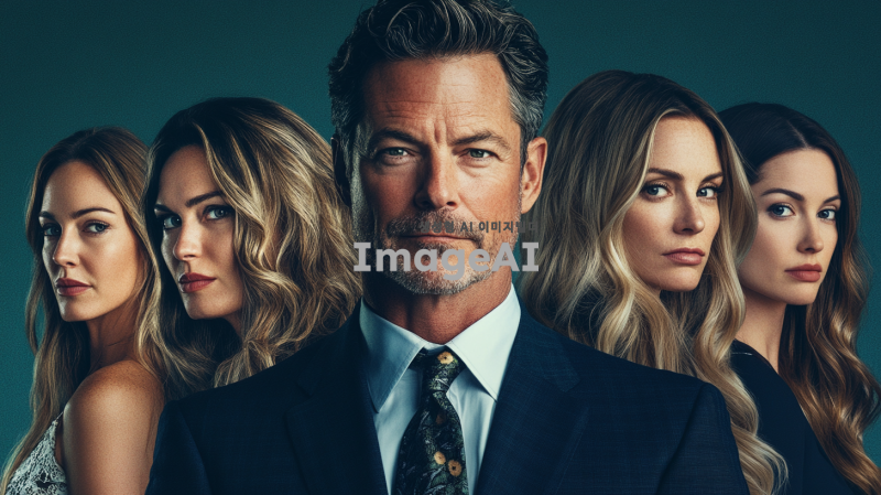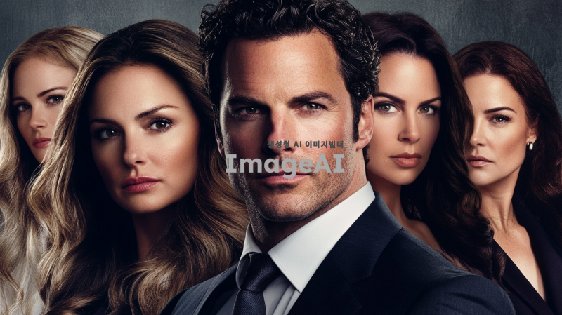 수트를 입고 비웃음 짓는 백인 남자 한명과 사뭇 진지한 표정의 각기 다른 백인 여자 세명이 등장하는 미국 불륜 드라마 포스터