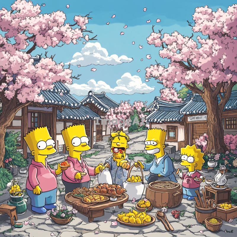 한국의 전통 마을에서 심슨 스타일의 캐릭터들이 일상 생활을 즐기고 있는 모습. 배경에는 한옥과 벚꽃이 만개한 나무, 그리고 푸른 하늘이 펼쳐져 있다. 캐릭터들은 각기 다른 표정을 지으며 웃고 있고, 주변에는 한국 전통 음식과 소품들이 배치되어 있다. 심플하고 유머러스한 느낌을 강조하여 그려주세요.