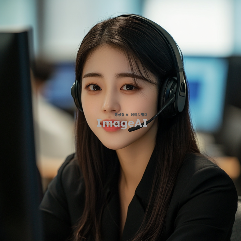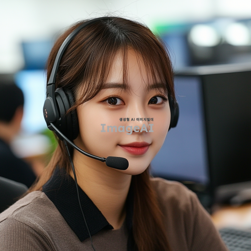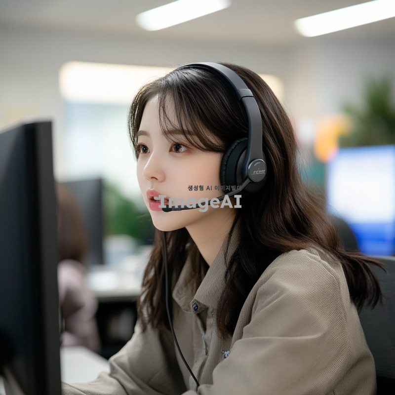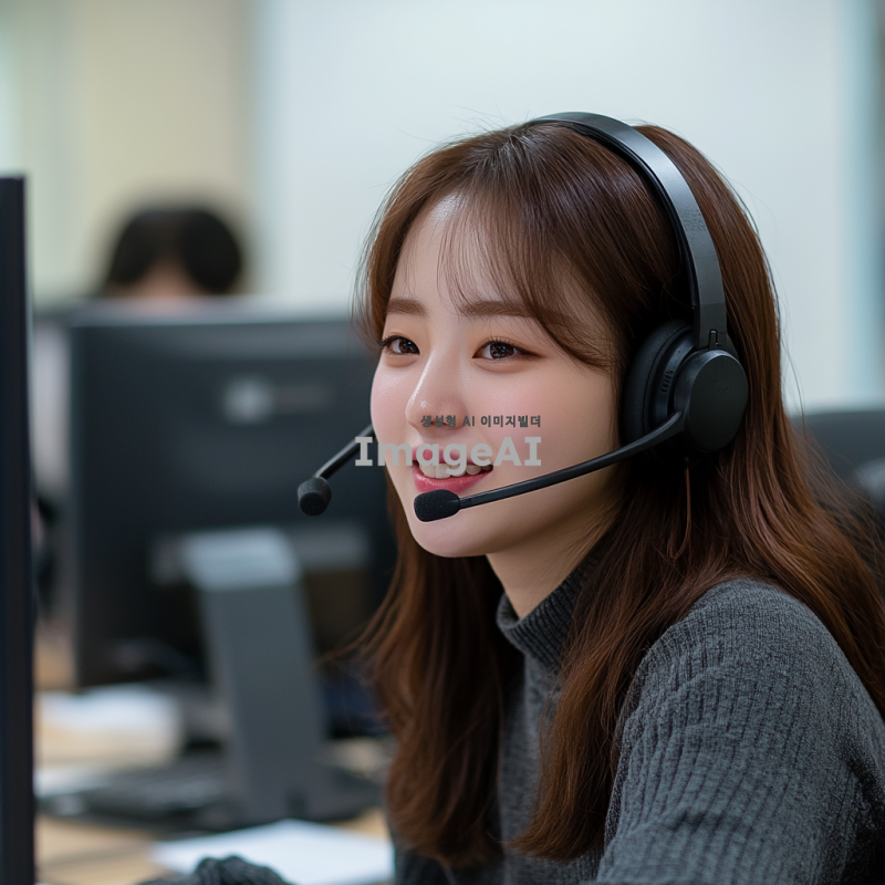 상담하고 있는 한국인 콜센터 직원, 헤드셋을 착용하고 컴퓨터 앞에서 고객과 대화 중인 모습, 친절한 표정과 전문적인 분위기, 배경에는 사무실 환경이 잘 보이도록, 자연스러운 조명과 따뜻한 색조의 조화, 다양한 고객 문의를 처리하는 모습, 집중하는 눈빛과 편안한 자세 강조.
