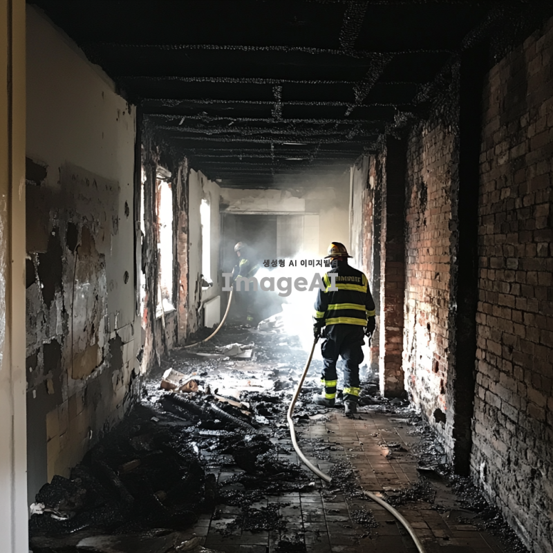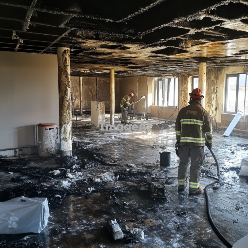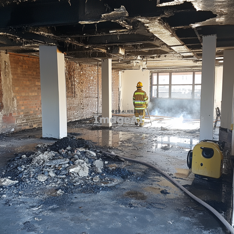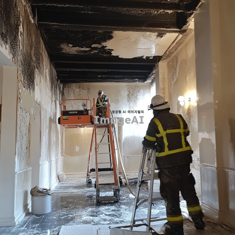 화재로 피해를 입은 공간을 청소와 복구 작업을 진행하는 모습