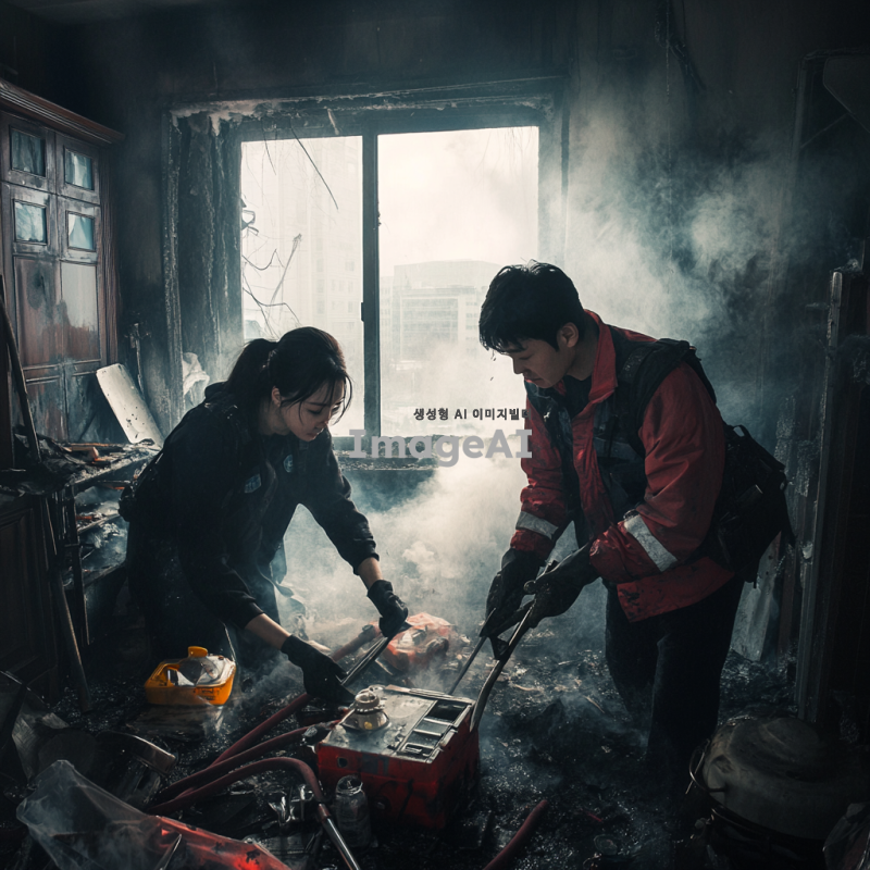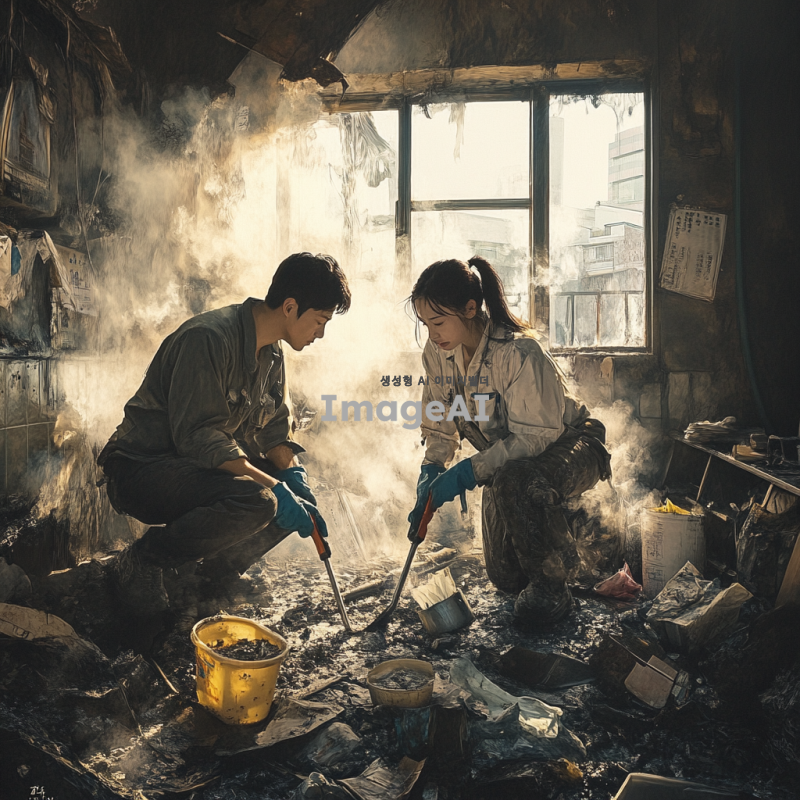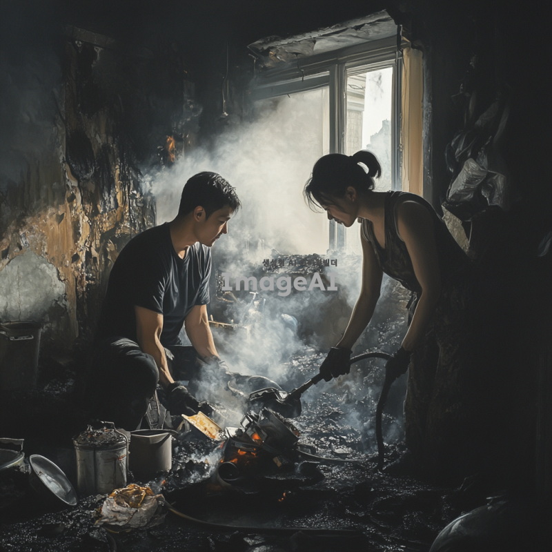 화재로 피해를 입은 공간에서 청소 작업을 하는 한국인 남성과 여성의 모습, 소방용 장비와 청소 도구를 사용하여 잔해와 재를 치우고 있는 장면, 주변에는 검은 연기와 불에 그을린 벽, 긴장감이 감도는 분위기, 희망적인 표정으로 협력하는 모습, 자연광이 들어오는 창문으로 밝은 빛이 비추는 모습
