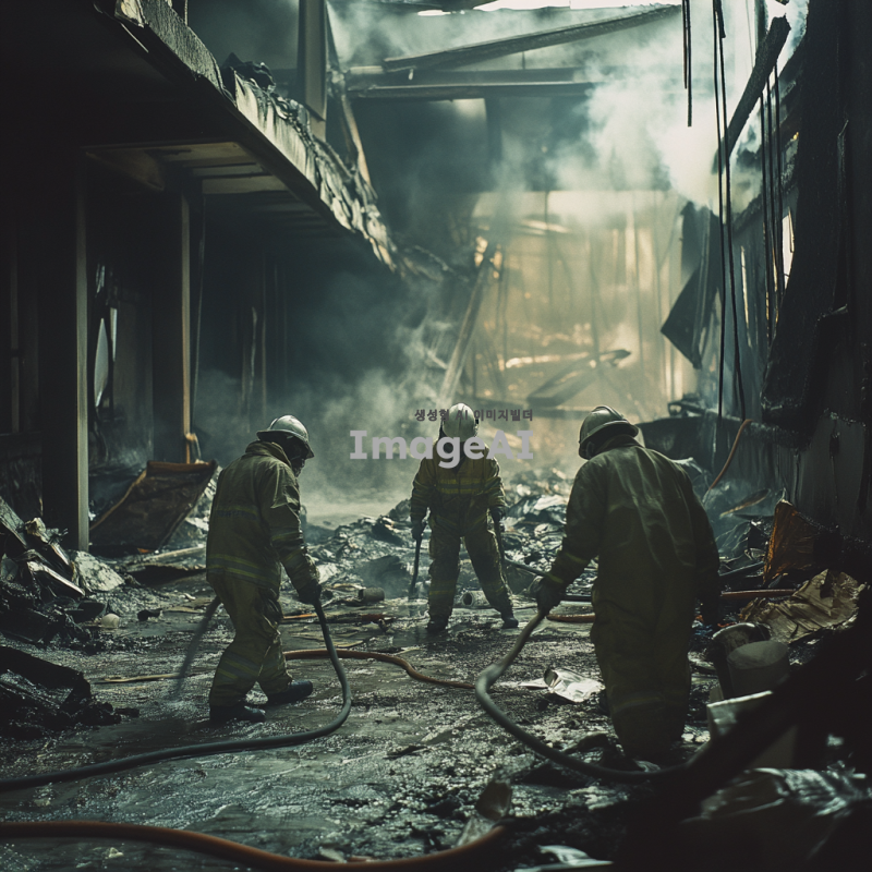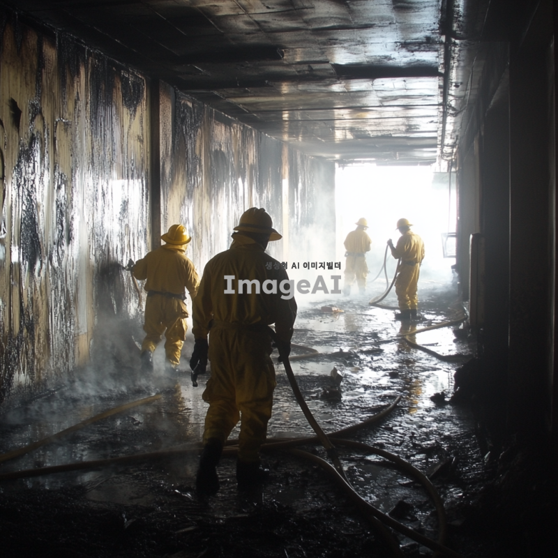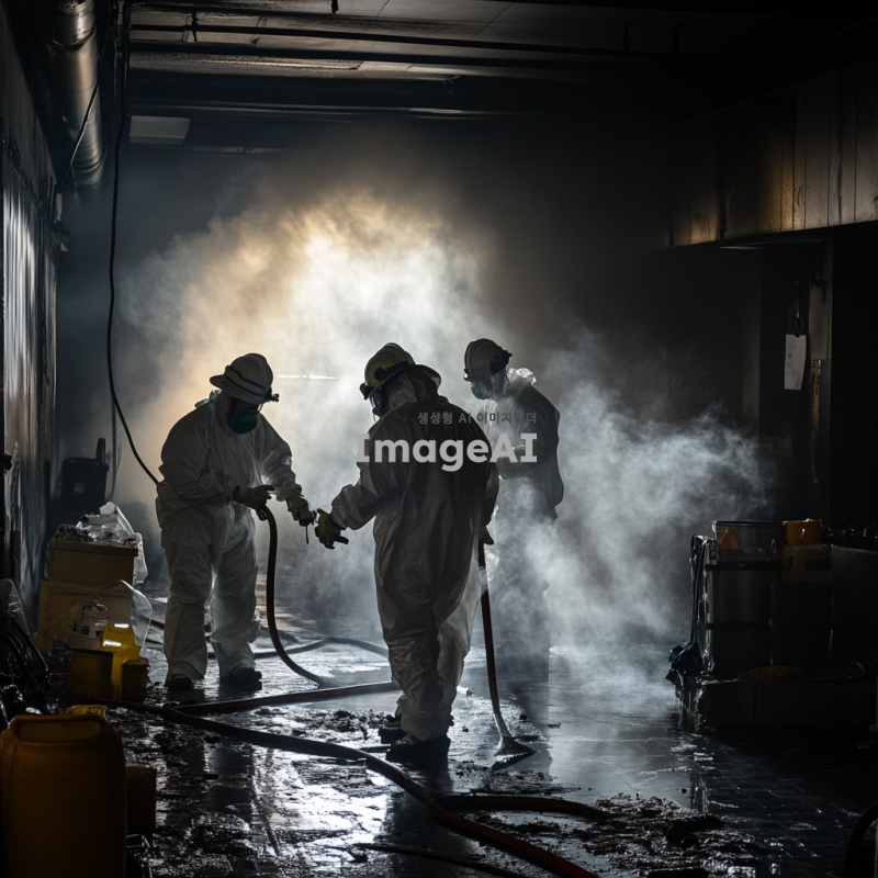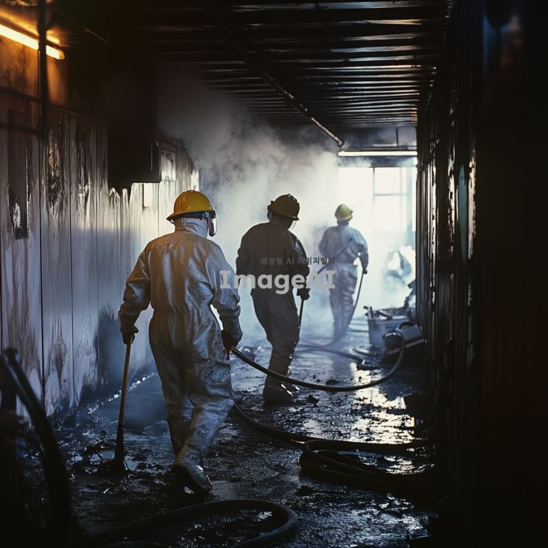 화재로 피해를 입은 공간에서 특수장비를 이용하여 청소하는 한국인 작업자들의 모습. 그들은 방염복을 입고 있으며, 연기가 자욱한 환경 속에서 집중하여 작업하고 있다. 주변에는 소방 장비와 청소 도구들이 어지럽게 놓여 있고, 벽면과 바닥에는 화재로 인한 그을음이 남아 있다. 작업자들은 협력하여 안전하게 청소 작업을 진행하고 있으며, 긴장감이 감도는 상황을 표현한다.