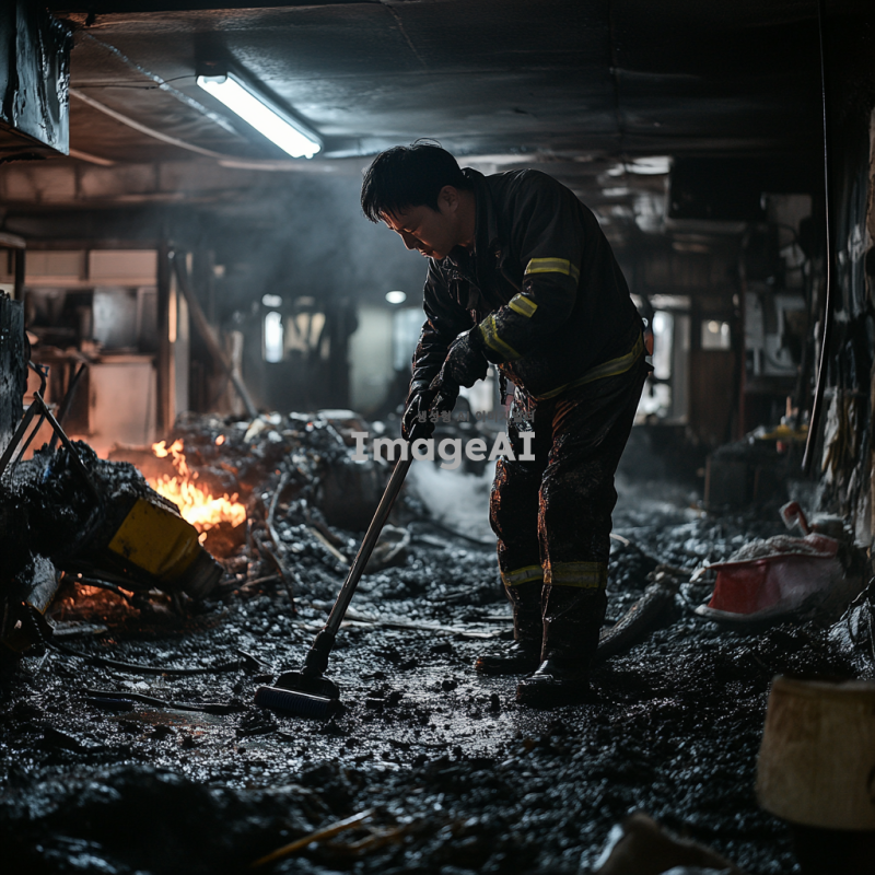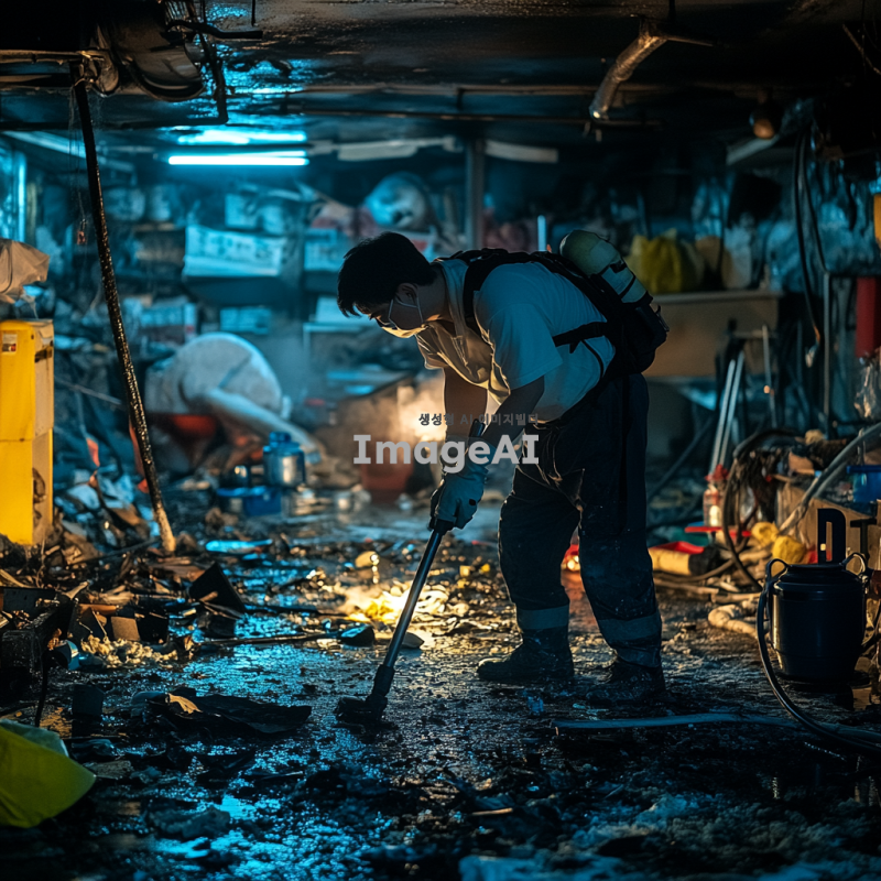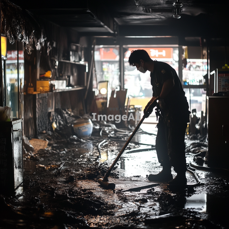 화재로 인해 그을리고 파손된 공간에서 청소장비를 이용하여 깨끗하게 청소하는 한국인 남성. 소방 후 잔해물과 그을음이 남아 있는 바닥을 청소기로 정리하는 모습. 주변에는 소방 장비와 소화된 잔해들이 보이고, 청소하는 사람은 안전 장비를 착용하고 있다. 밝은 조명 아래에서 청소 작업에 집중하는 모습.
