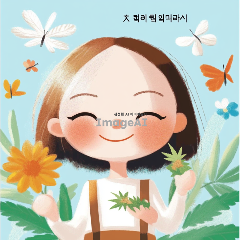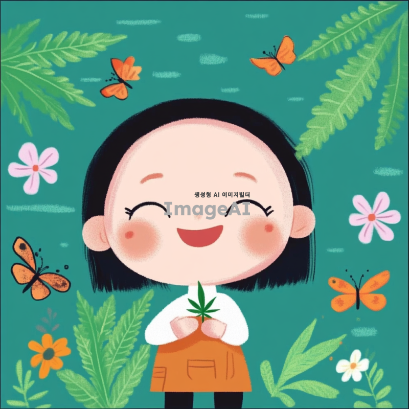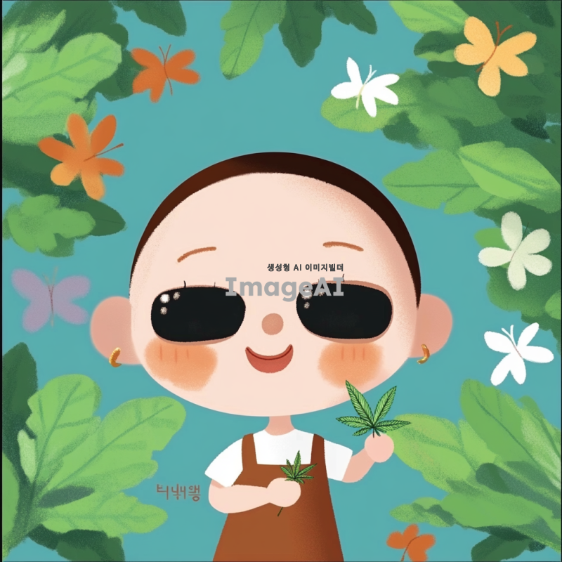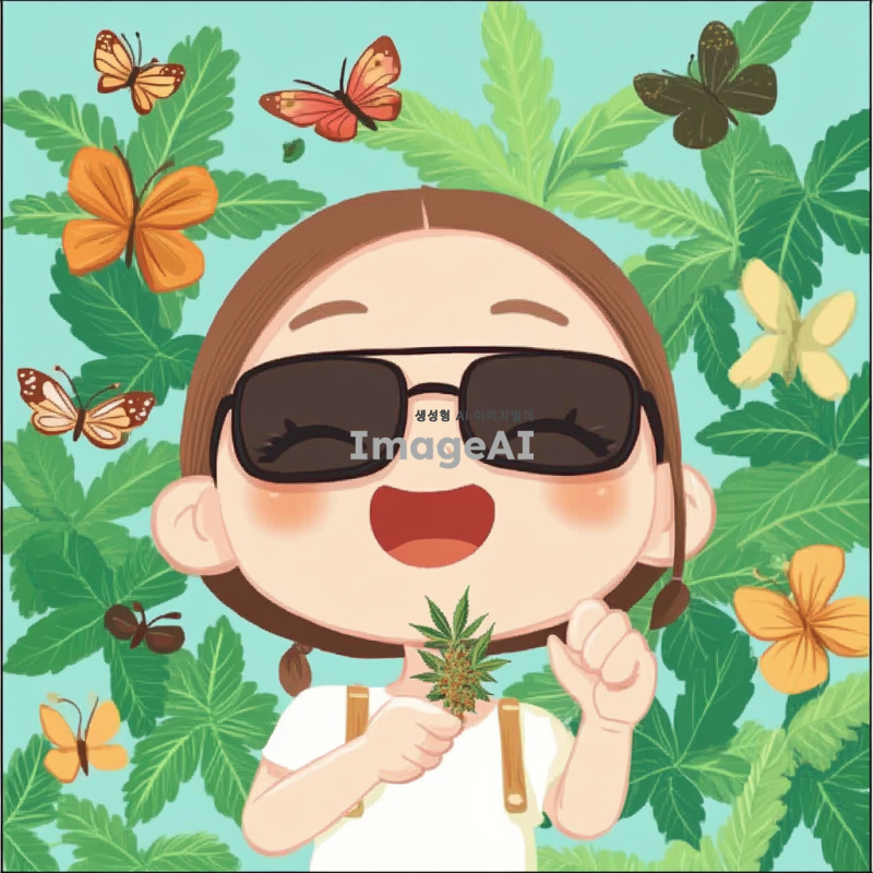 귀여운 캐릭터가 초록색 대마초 잎을 배경으로 행복하게 웃고 있는 모습. 캐릭터는 한국인 소녀로, 귀여운 표정을 지으며 손에 작은 대마초를 들고 있다. 주변에는 다양한 색상의 꽃과 나비들이 날아다니고, 햇살이 비치는 따뜻한 날씨를 표현한다. 전체적으로 아기자기하고 사랑스러운 분위기를 강조한다.