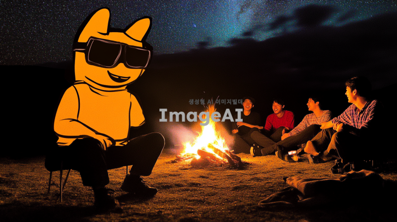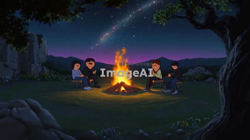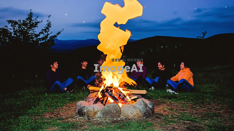 칠 가이 모닥불을 중심으로 한 따뜻한 밤, 불빛에 비친 일곱 명의 한국인 친구들이 모여 앉아 이야기를 나누고 있는 모습. 그들 주변에는 자연의 아름다움이 가득하고, 별빛이 빛나는 하늘이 펼쳐져 있다. 모닥불의 불꽃이 춤추며 주변을 환하게 비추고, 친구들은 서로 웃으며 즐거운 시간을 보내고 있다.