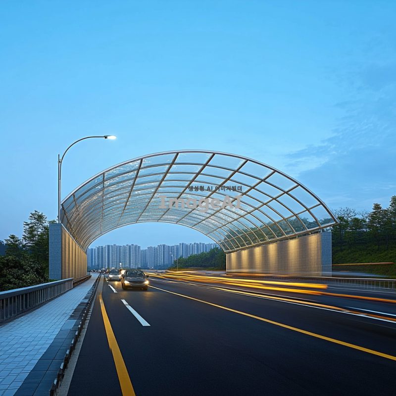 왕복 6차선 도로 위에 위치한 반투명 방음터널의 모습. 현대적인 디자인으로, 터널의 외관은 반투명 유리로 구성되어 있으며, 주변 자연 경관과 조화를 이루고 있다. 도로 위에는 차량들이 원활하게 이동하고 있고, 터널 안쪽은 조명이 은은하게 비추고 있다. 터널의 구조는 유선형이며, 안전과 편안함을 고려한 설계가 돋보인다. 배경에는 푸른 하늘과 나무들이 어우러져 있는 풍경이 펼쳐져 있다.
