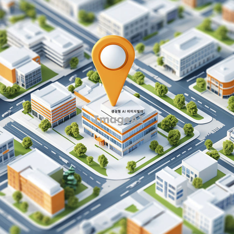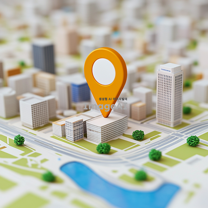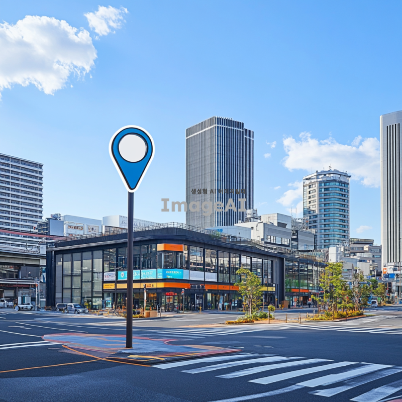 지도 위에 입지 마크가 표시된 이미지, 좋은 입지인 역세권에 위치한 상업지역의 모습, 다양한 건물과 상업시설들이 조화롭게 배치된 모습, 규모감 있는 건물들이 강조되어 있는 장면, 밝고 현대적인 색감으로 시각적으로 매력적인 디자인.