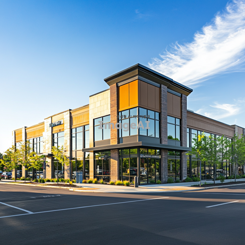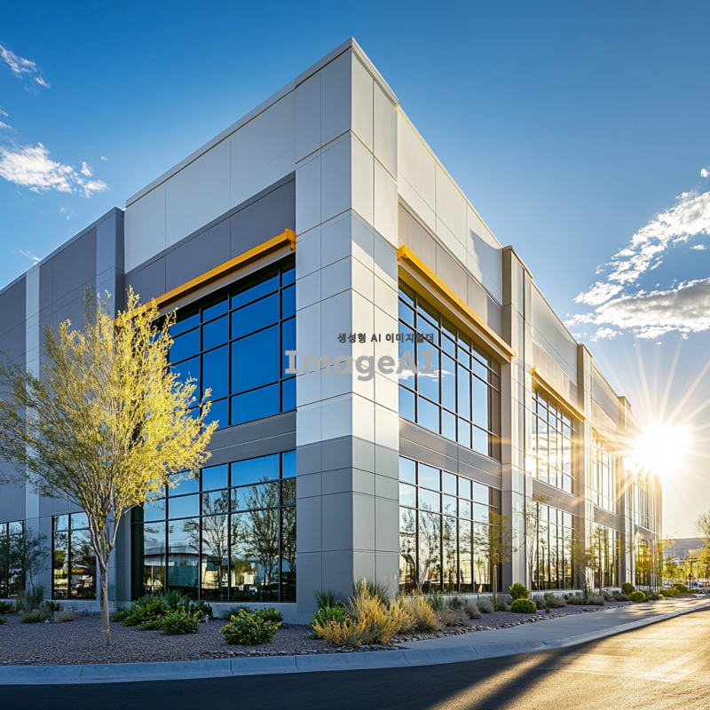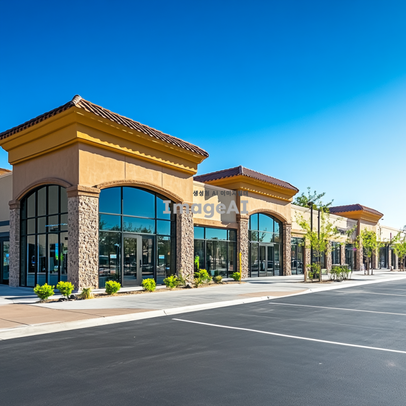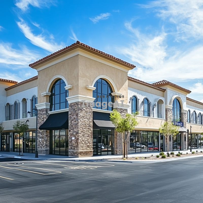 수익률이 높은 자산을 배경으로 한 이미지, 상업용 건물의 외관을 강조하고, 주변에 신뢰감 있는 임차인들이 있는 모습, 밝고 긍정적인 분위기, 경제적 안정성을 나타내는 요소들, 현대적인 디자인과 세련된 건축 양식, 푸른 하늘과 햇살이 비치는 날씨.