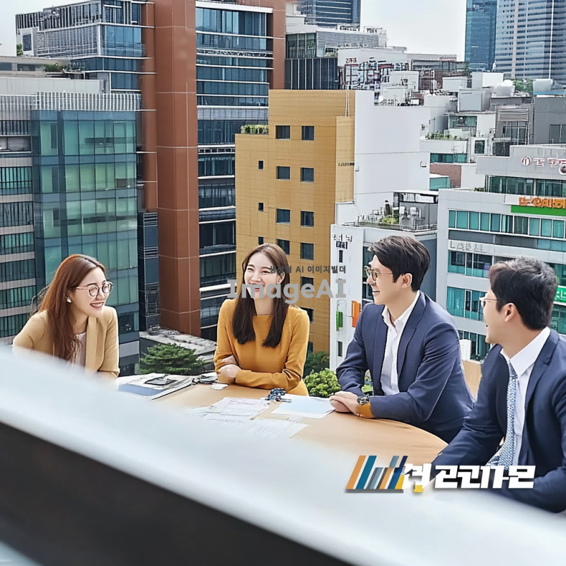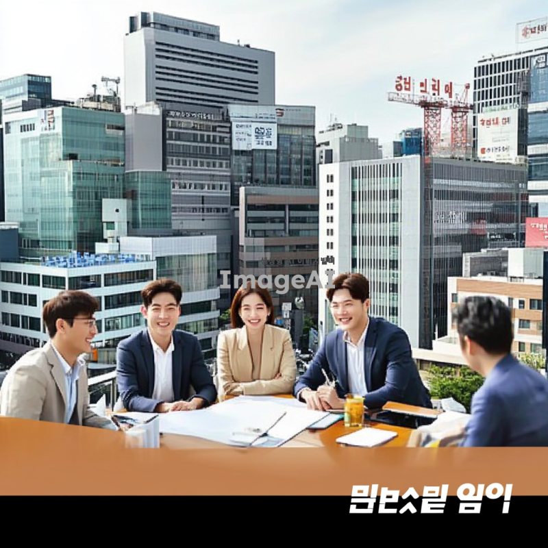 중소형 오피스 빌딩 배경에 우상향 수익률 그래프가 함께 있는 장면, 투자자와 임차인이 함께 웃고 있는 모습이 작게 보이는 이미지. 밝고 긍정적인 분위기, 현대적인 디자인, 한국인 남녀가 함께하는 모습.