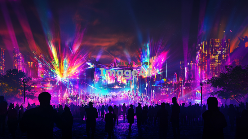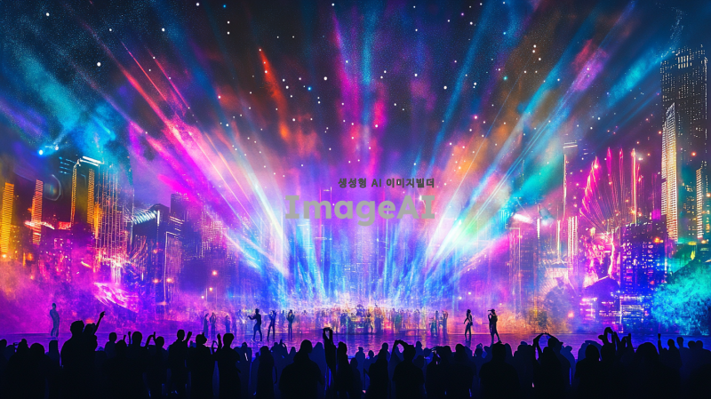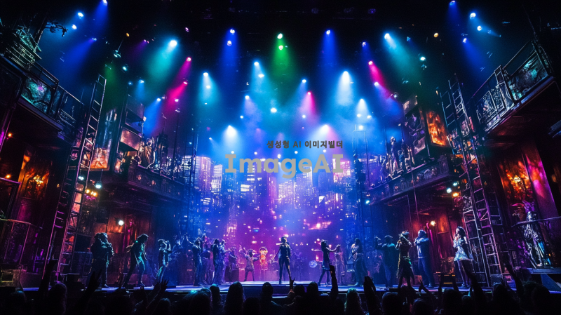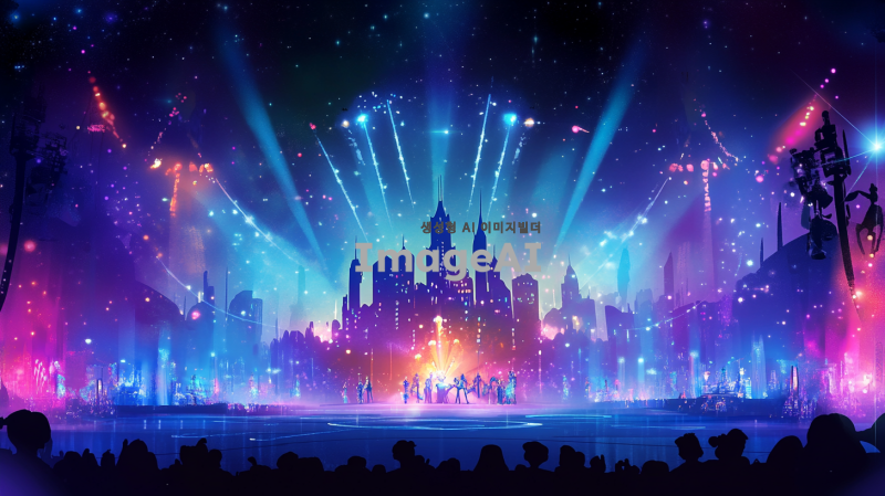 밝고 화사한 무대 풍경, 다양한 색상의 조명과 화려한 장식이 어우러진 공연 장면, 관객들이 즐겁게 감상하는 모습, 무대 위에는 다양한 아티스트들이 공연 중인 모습, 배경에는 아름다운 도시의 실루엣이 보이는 장면, 전체적으로 활기차고 즐거운 분위기.