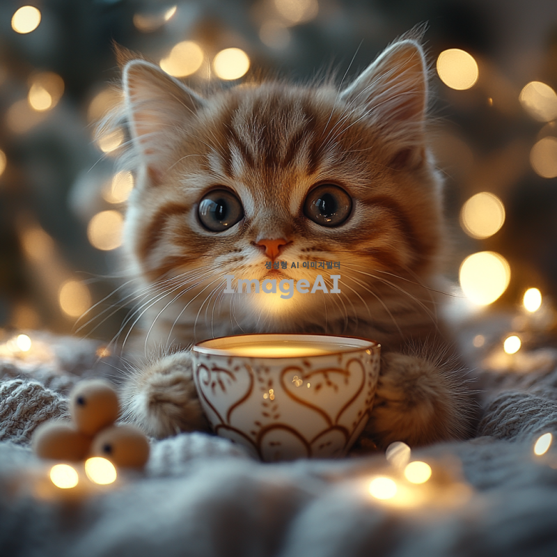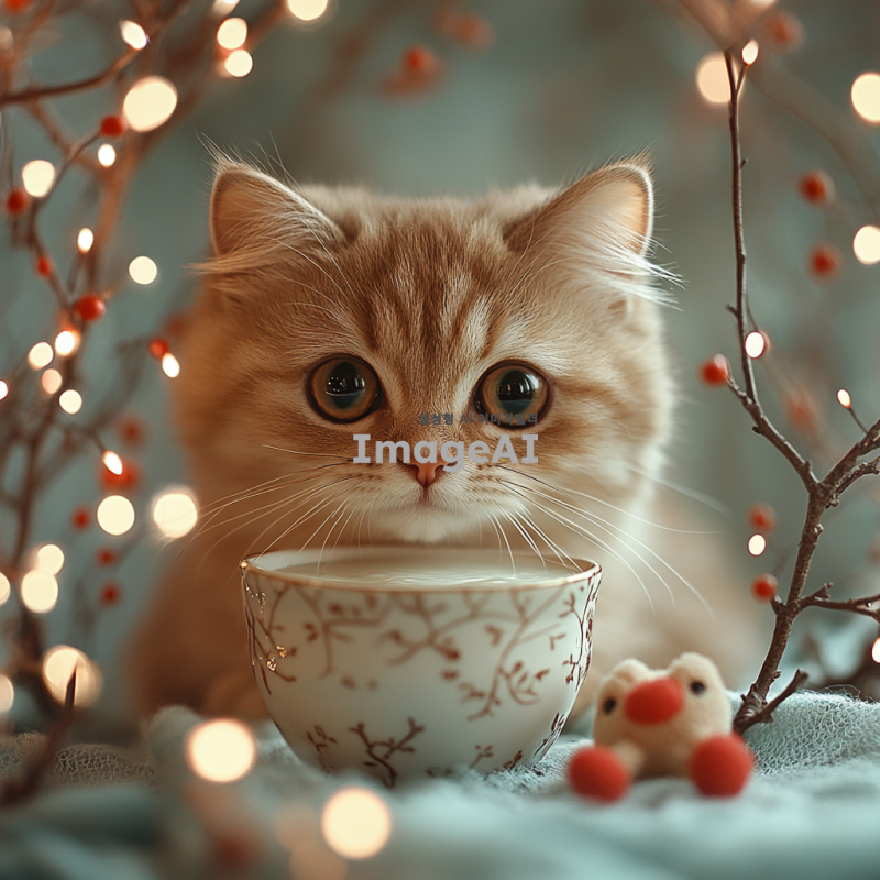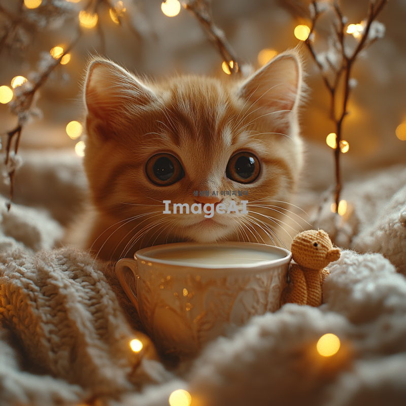 귀여운 고양이가 우유를 먹고 있는 모습, 부드러운 색감의 아기자기한 배경, 고양이의 큰 눈과 귀여운 표정, 우유 그릇 옆에 놓인 작은 장난감, 따뜻하고 아늑한 분위기, 동화 같은 느낌.