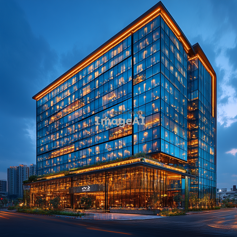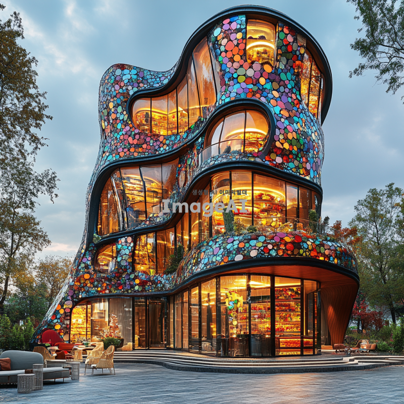 과자로 지은 5성급 호텔, 화려한 디자인의 외관, 주변 건물보다 높고 웅장한 모습, 다양한 색상의 과자들로 장식된 호텔, 햇빛을 받아 반짝이는 모습, 현대적인 도시 풍경, 따뜻한 분위기, 화려하면서도 단정한 느낌