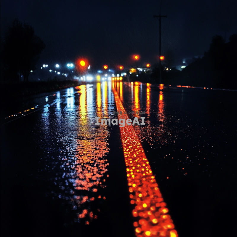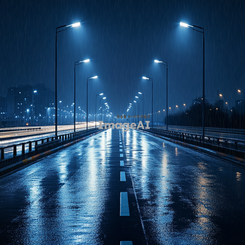 비 오는 밤, 도로 위에 반사된 빛나는 LED 차선이 있는 풍경. 어두운 하늘과 비가 내리는 모습, 도로에 물이 고여 빛이 반사되는 장면을 강조. 주변에 흐릿하게 보이는 도시의 불빛과 함께, 차선이 선명하게 빛나는 모습.