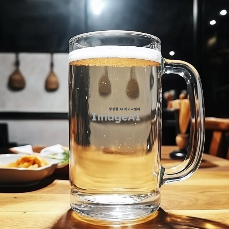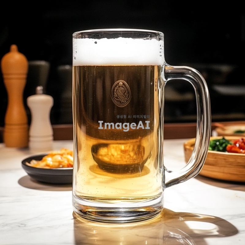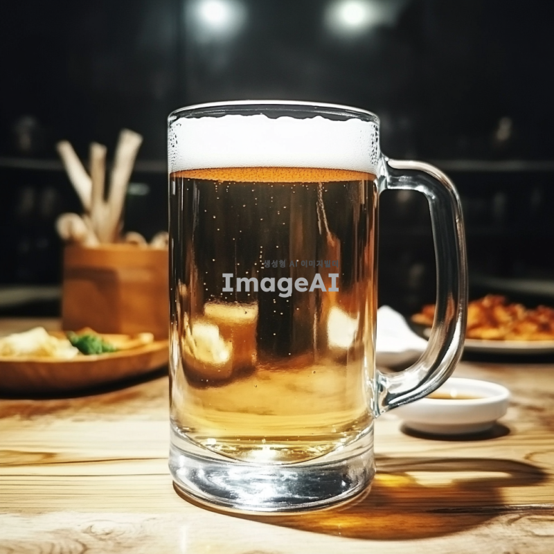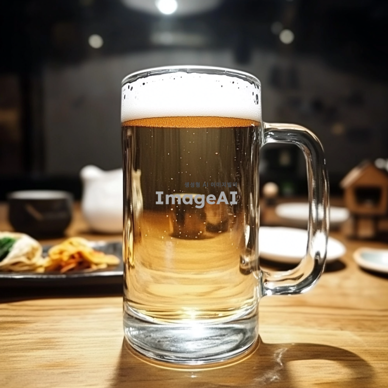 한국의 전통적인 술집 내부, 나무 테이블 위에 놓인 맥주잔, 맥주가 가득 담긴 모습, 따뜻한 조명 아래에서 반짝이는 맥주, 주변에 간단한 안주와 함께하는 아늑한 분위기, 한국의 전통 소품들이 배경에 있는 장면.
