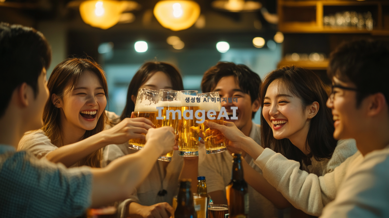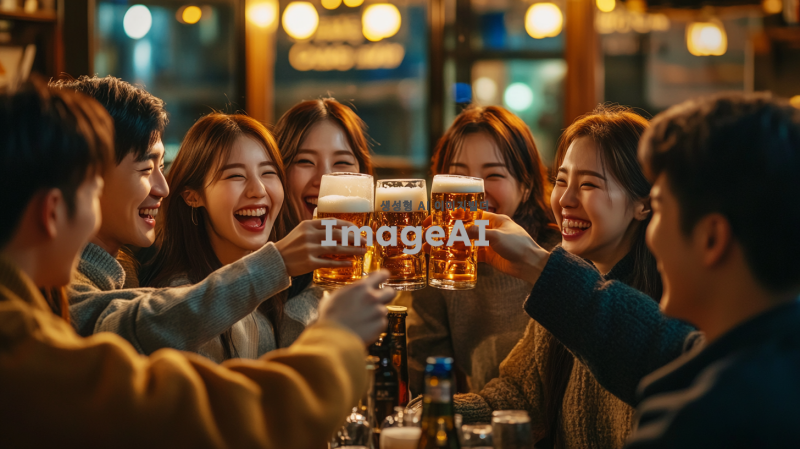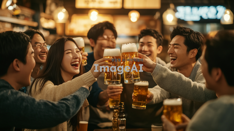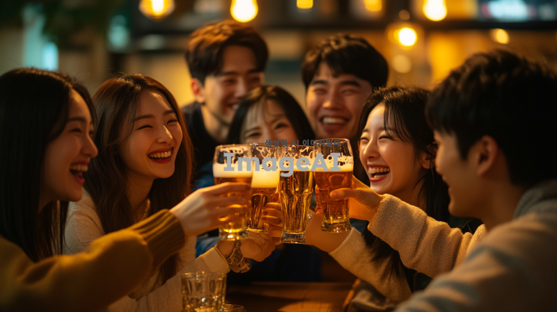 한국의 호프집에서 맥주잔을 한 손에 들고 서로를 바라보며 건배하는 8명의 한국인 그룹. 20대 여자 1명(170cm)과 20대 여자 1명(160cm), 40대 남자 5명, 40대 여자 1명. 모든 사람들은 밝고 즐거운 표정을 짓고 있으며, 따뜻한 조명이 비추는 아늑한 분위기 속에서 함께 웃고 있는 모습. 배경에는 호프집의 아기자기한 인테리어와 맥주잔들이 보인다.
