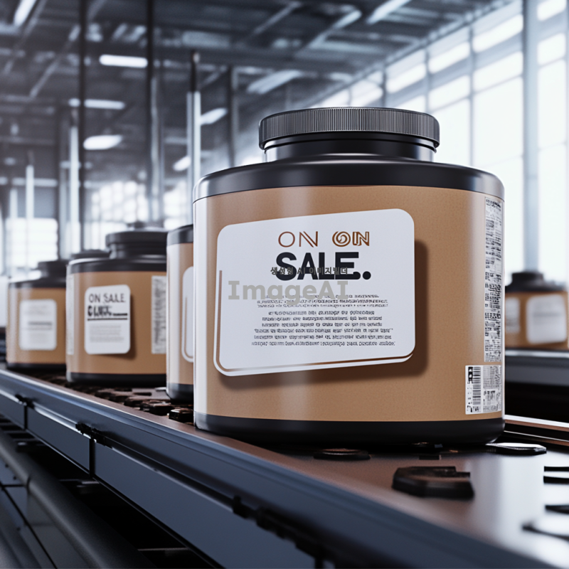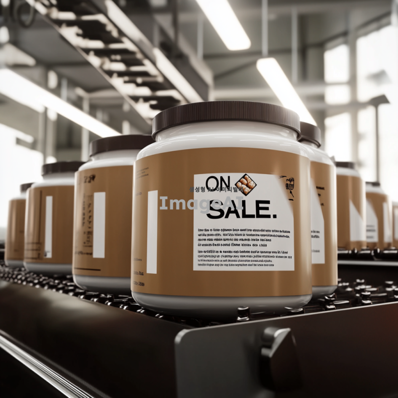 컨베이어 벨트 위에 단백질 용기가 대량으로 생산되고 있는 과정의 이미지로 생성 부탁해.