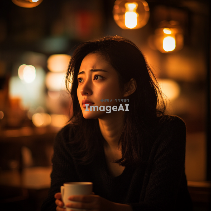 30대 한국인 여성, 힘든 상황에 처해 있는 모습, 지친 표정과 피로한 눈빛, 주변은 어지럽고 혼란스러운 환경, 감정적으로 힘들어 보이는 모습, 현실의 압박을 느끼는 듯한 분위기, 따뜻한 조명이 비추는 한적한 카페에서 혼자 앉아 있는 모습, 손에 커피 잔을 들고 있는 모습, 심리적 고통을 표현하는 감정적인 포즈.